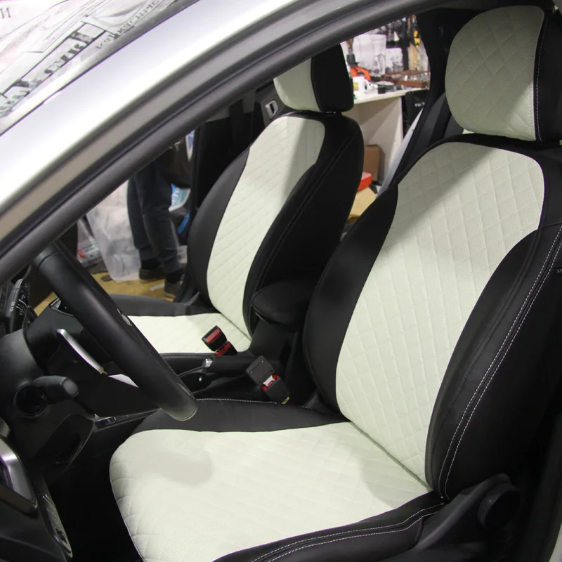 Тыльные и боковые части чехлов сделаны из гладкой экокожи, а центральная часть из перфорированной экокожи, алькантары или велюра.