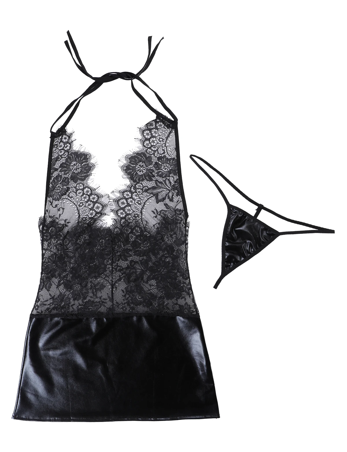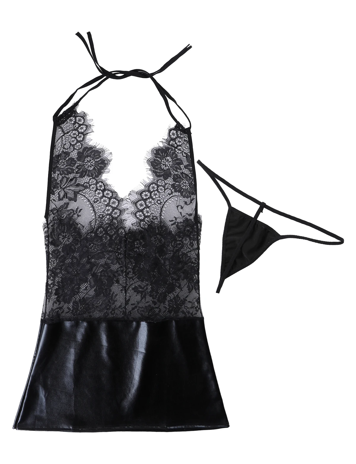 Платье с лямкой на шее и открытой спиной, с завязками на спине, глубоким v-образным вырезом, прозрачным сетчатым кружевом, пышной юбкой и трусиками-стринги подчеркивают ваши очаровательные изгибы.