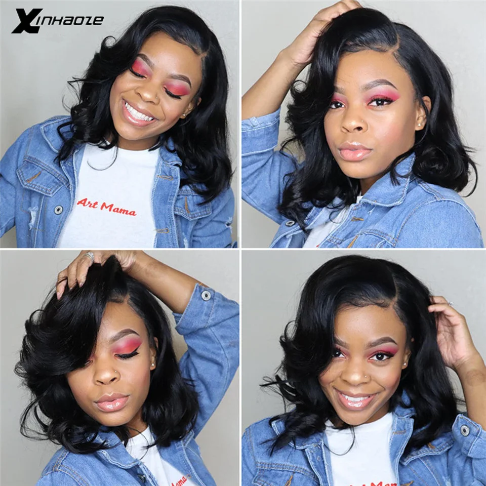 Натуральные черные кружевные передние человеческие волосы, парики для женщин, предварительно выщипанные бразильские волосы Remy, боковая часть, короткий Боб, волна 13x5, парик с фронтальной шнуровкой