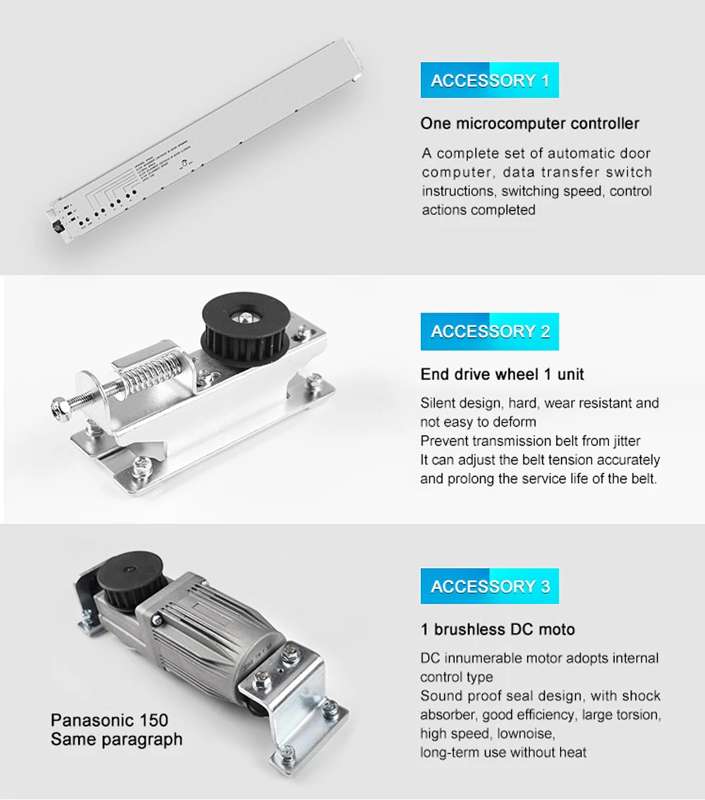 1. Полный набор автоматических дверных компьютеров, инструкции переключателя передачи данных, скорость переключения, контроль действий завершены 2. Подвешивание подвижного дверного вентилятора для привода хода дверного вентилятора под тягой двигателя 3. Звукоизолирующая конструкция уплотнения, с амортизатором, хорошая эффективность, большая кручение, высокая скорость, Низкий уровень шума, долгосрочное использование без тепла 4. Он может точно регулировать натяжение ремня и продлить срок службы ремня. 5. Бесщеточный двигатель постоянного тока с небольшим размером и достаточной мощностью. Низкий уровень шума, длительный срок службы, прочная и долговечная обработка поверхности абразивным покрытием из алюминиевого сплава. Полностью герметичная внутренняя структура, долговечная и без утечки масла и имеет защитную линию устройства, даже если частое открытие и закрытие также может достичь долгосрочной безотказной работы