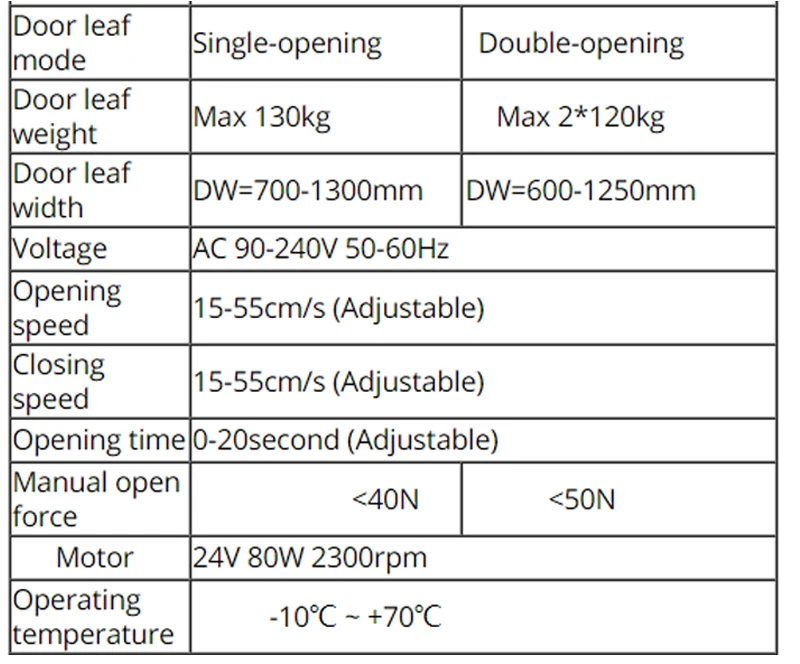 Технология управления микропроцессором и передовое механическое производство. Технология управления микропроцессором и передовое механическое производство. Самообучение при включении, эта функция выбирается пользователем. Цифровой экран, легко и точно настроить рабочие данные. Бесщеточный двигатель постоянного тока, длительный срок службы и низкий уровень шума (менее 40dp). Анти-зажим при закрытии и открывании. Функциональные клеммы для электронного замка, клавиатуры доступа, функциональная клавиатура, функциональный пульт и так далее. Специальные клеммы для противозажимного бокового датчика, большей безопасности. Квадратный двигатель для узкого входа.