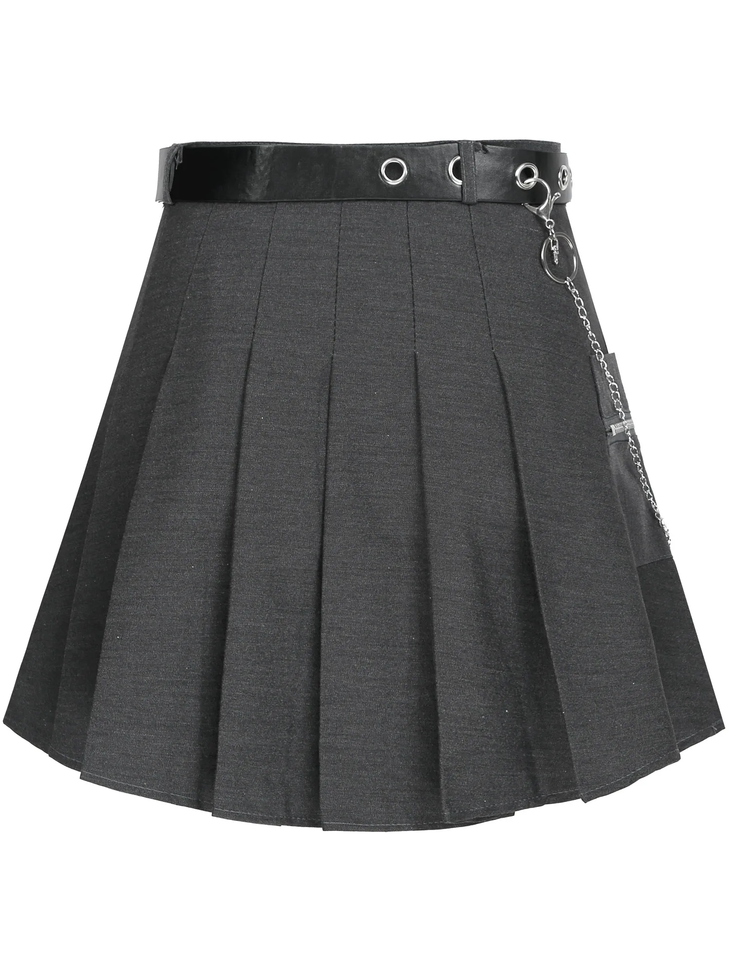 Высокая талия, застежка на молнии, боковой карман, сплошной цвет, плиссированная юбка длиной до бедра, пара с поясом и металлической цепочкой.