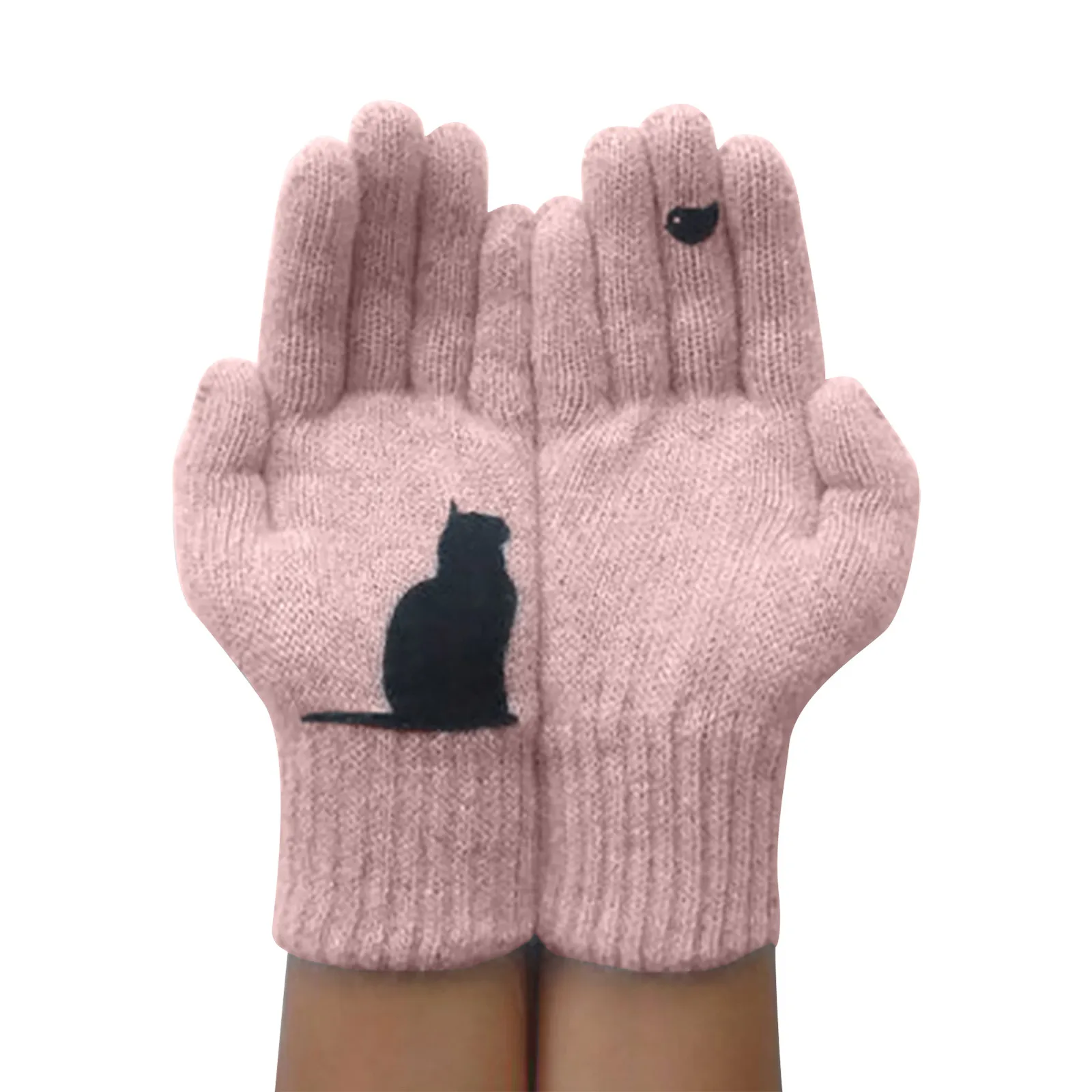 Женские шерстяные перчатки осень-зима, теплые перчатки с принтом кота