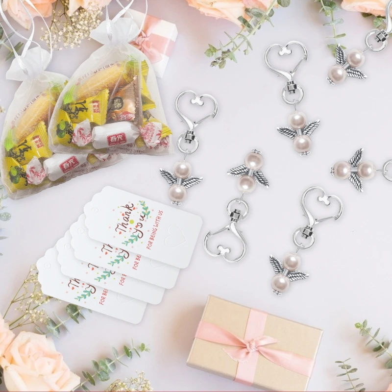 24 шт. брелки для ключей в виде ангела Плюс сумки из органзы Плюс бирки из крафт-бумаги с благодарностью для гостей, сувениры для детского дня рождения, свадебный подарок на вечеринку
