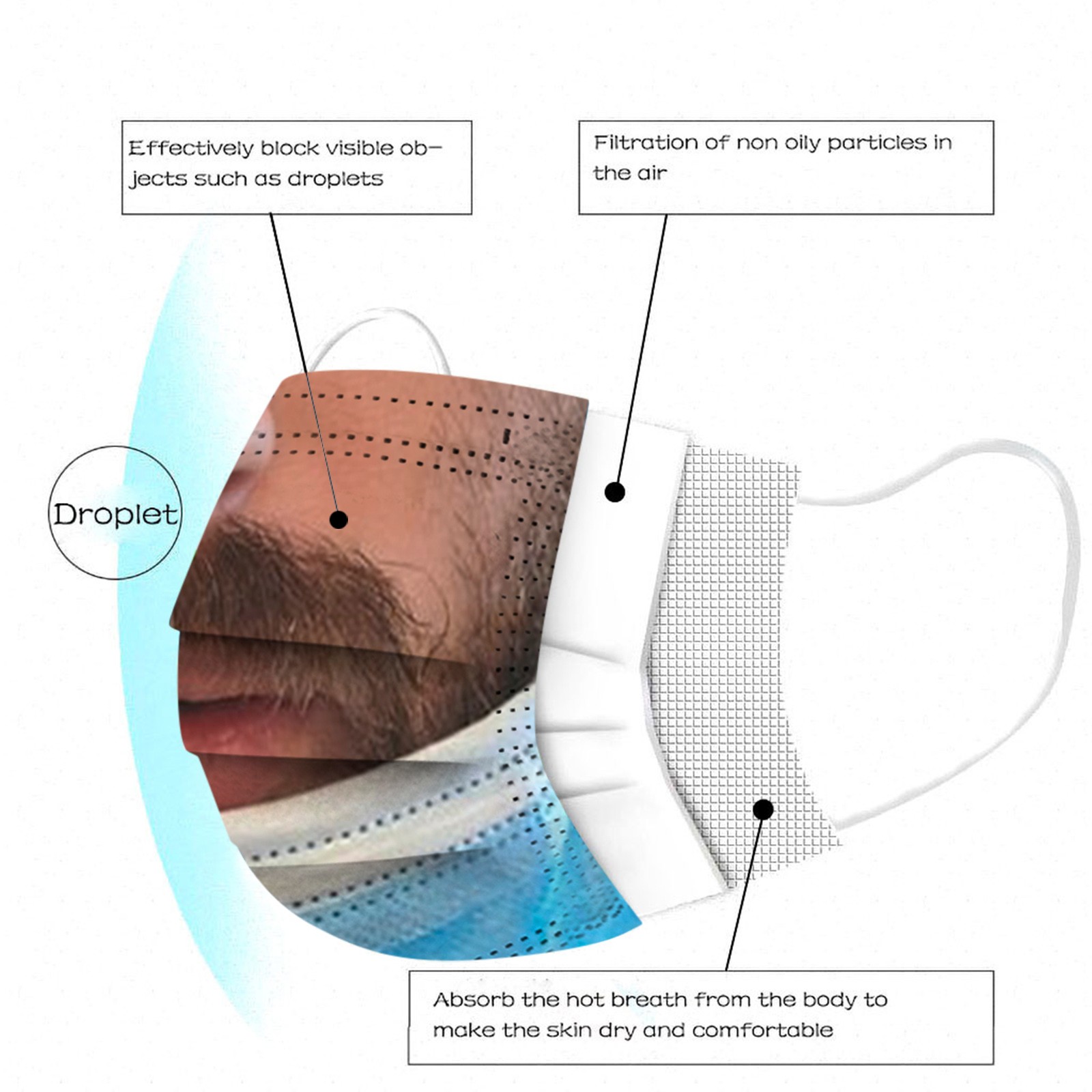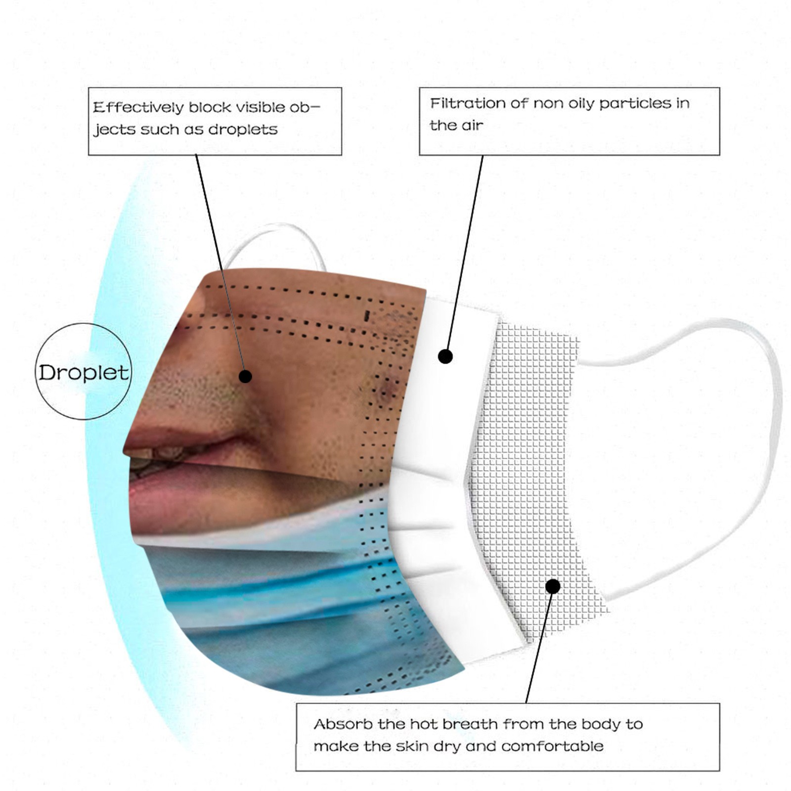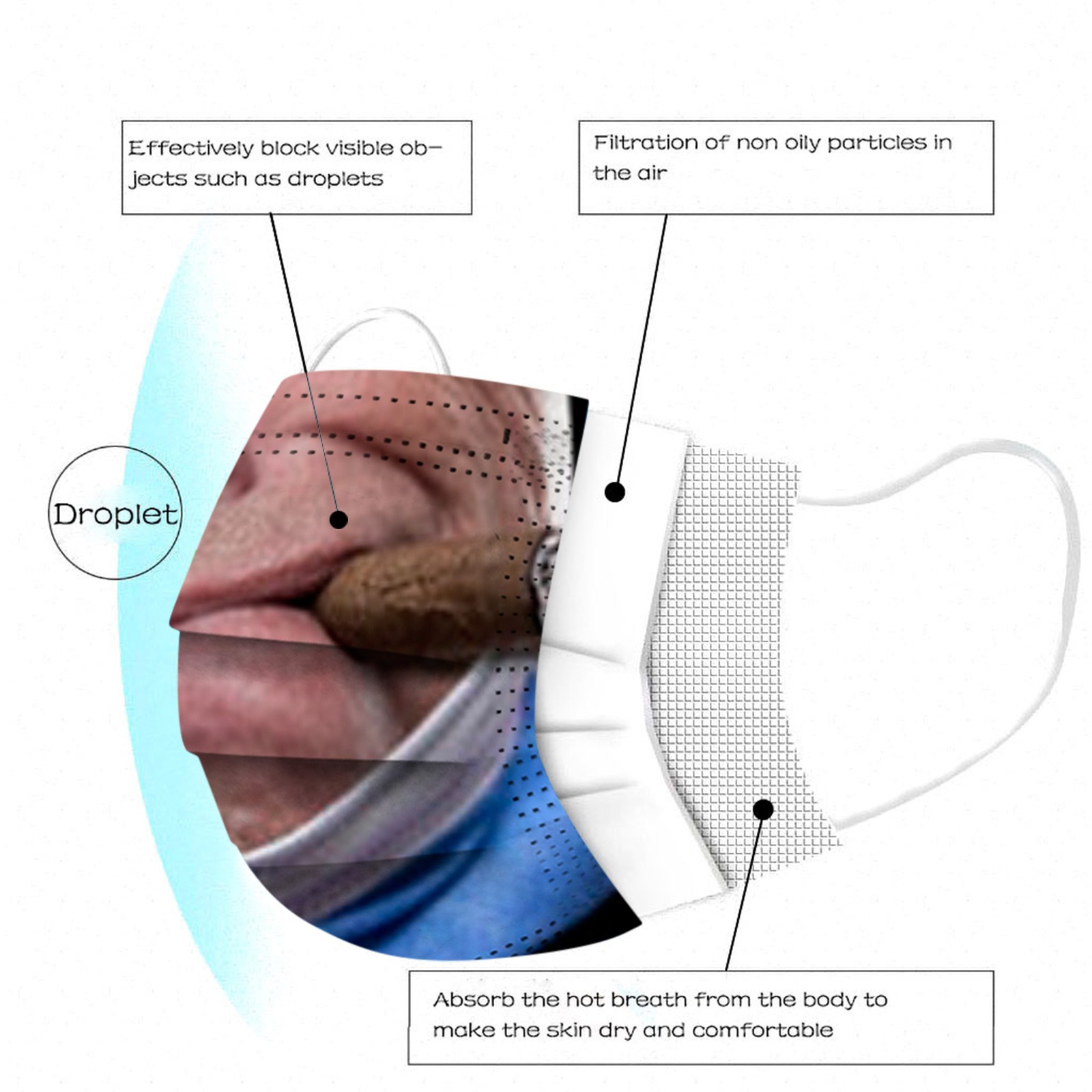 3 слоя гидросплетенная ткань одноразовая маска изготовлена из 3 слоев материала спанлейс, он безопасен для здоровья и безопасный для вас, чтобы использовать. Дышащий материал и милые узоры, что делает его полезным и модным. Специальный 3 слоя из нетканого материала, дизайн, обеспечивает некоторые меры защиты от пыли, автомобильный отходящий газ, пыльцу и т. Д. Эластичная петля уха позволяет легко снимать и надевать цепочку и не давит на уши. Маникюрный салон или любые другие области, где может потребоваться защита