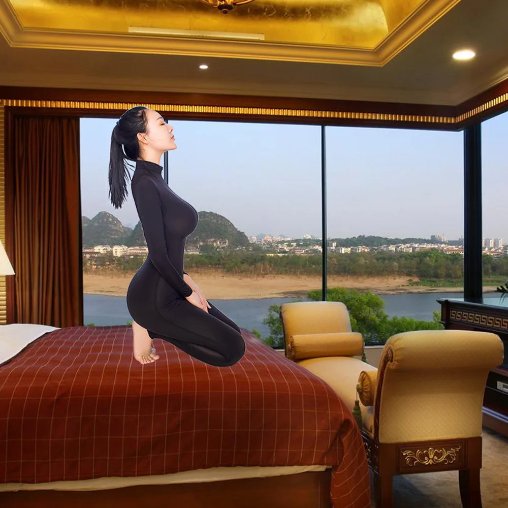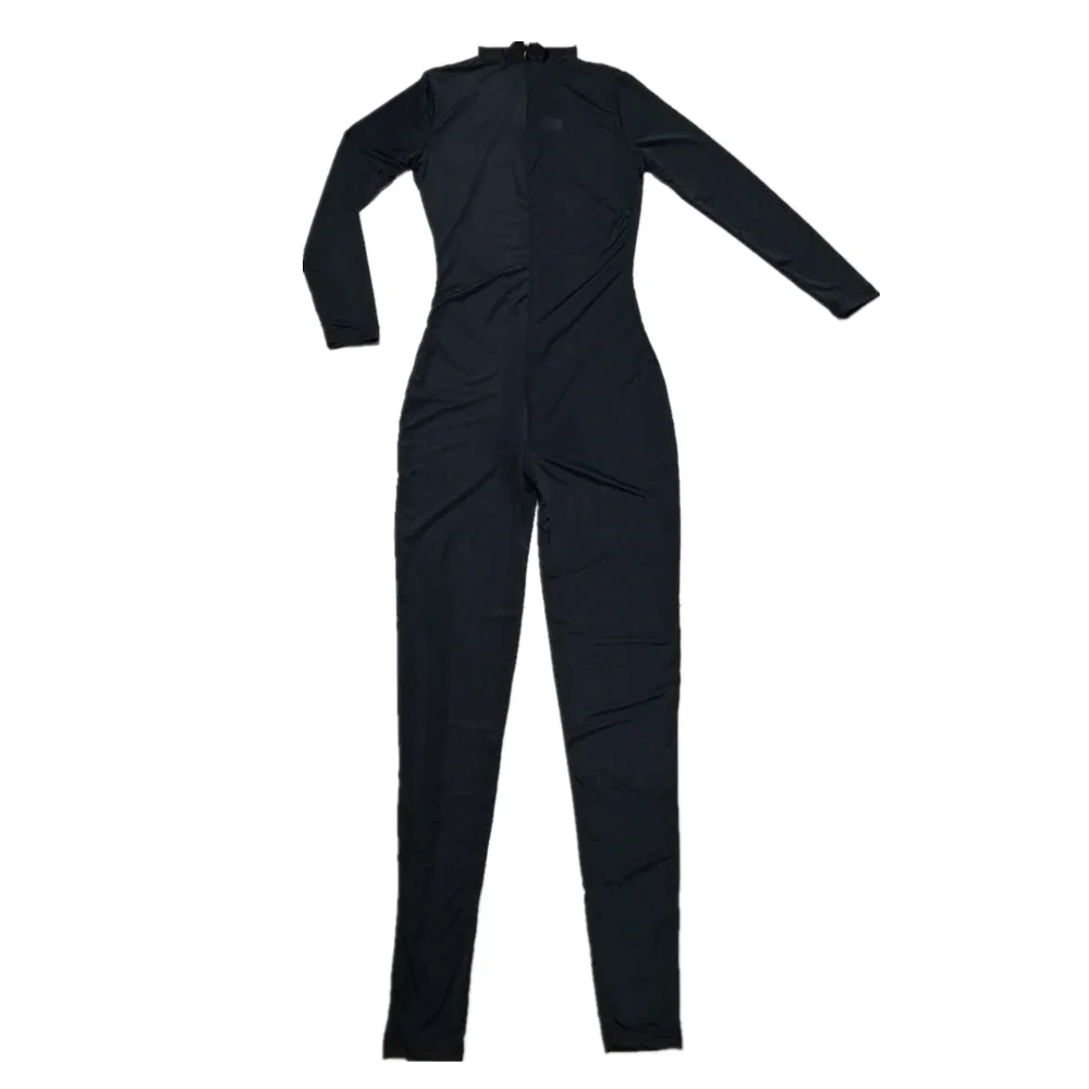 Двойная молния тянет от воротника к задней части ягодиц, чтобы открыть промежность.