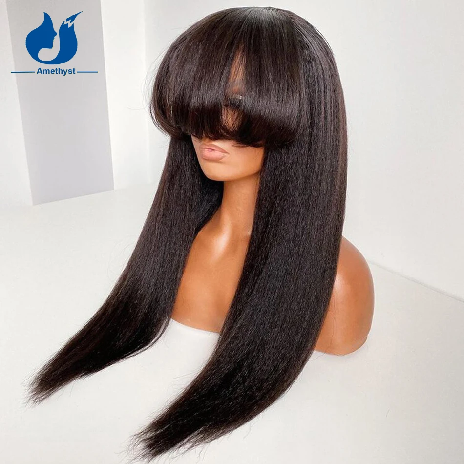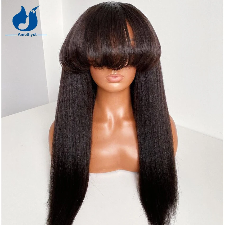 Аметист яки прямые человеческие волосы парики с челкой Бразильские волосы Remy полная машина Сделано о часть головы Топ парик яки прямые парики