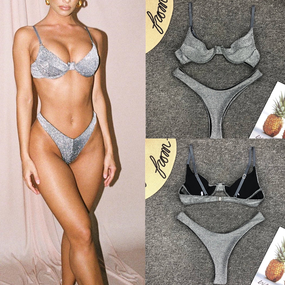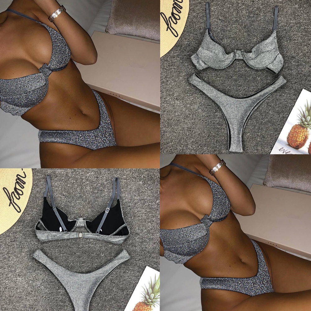 Здравствуйте! Добро пожаловать в наш магазин!Качество на первом месте и самый лучший сервис. Все клиенты-наши друзья Модный дизайн, 100% новый бренд, высокое качество! Материал: полиэстер Цвет: серебристый Стиль: комплект бикини с пуш-ап Размер: S M L