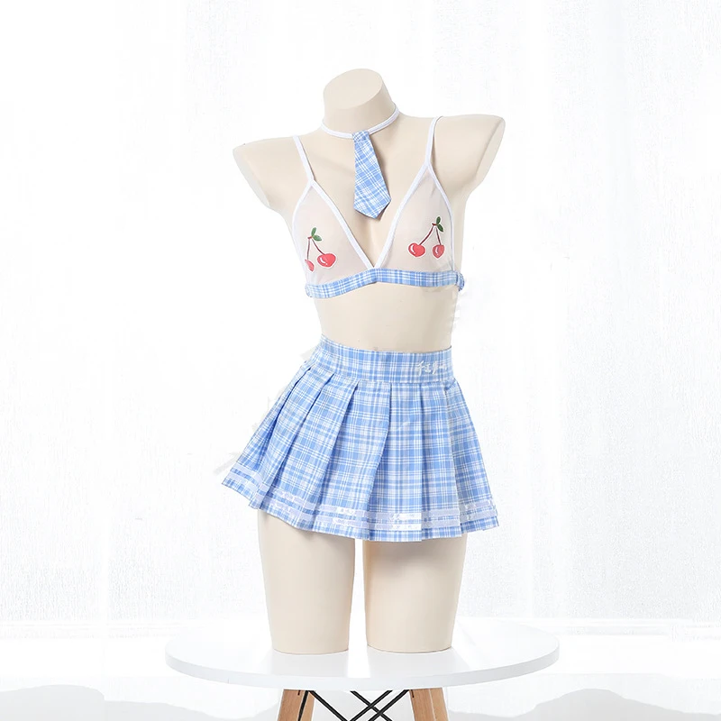 Милый сексуальный прозрачный костюм с бюстгальтером с вишнями, школьная форма для девочек в стиле Лолиты, плиссированная юбка, комплект нижнего белья для косплея для студентов