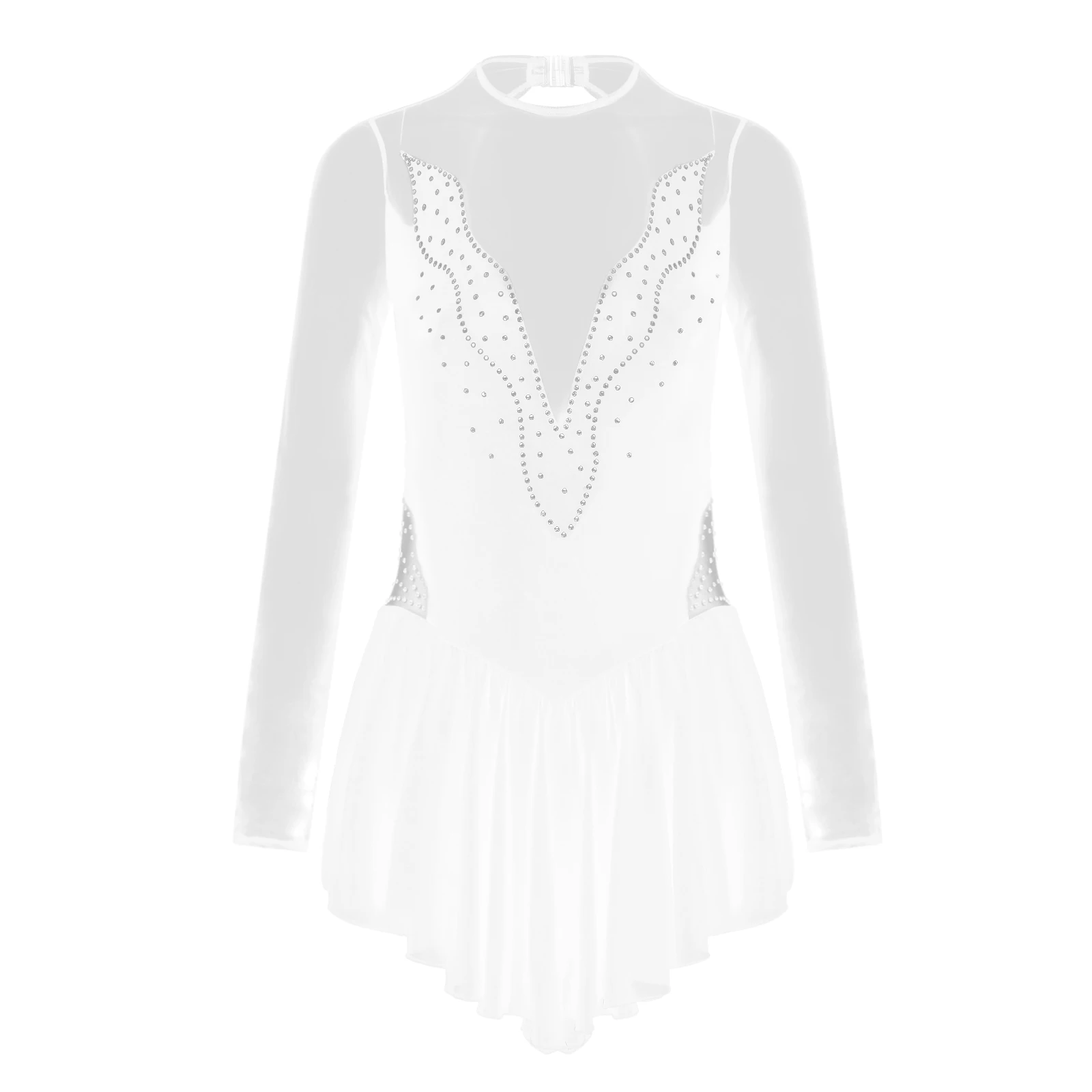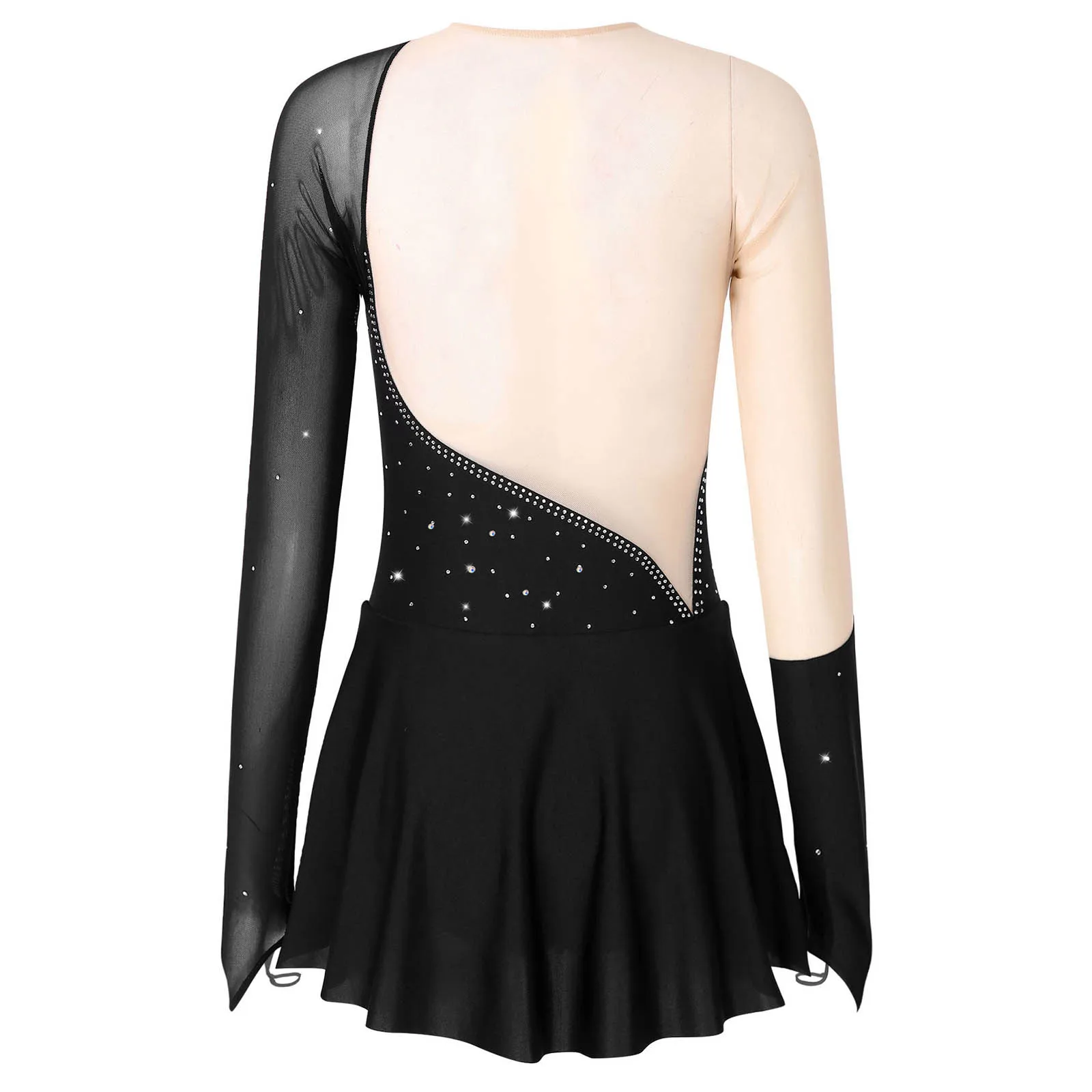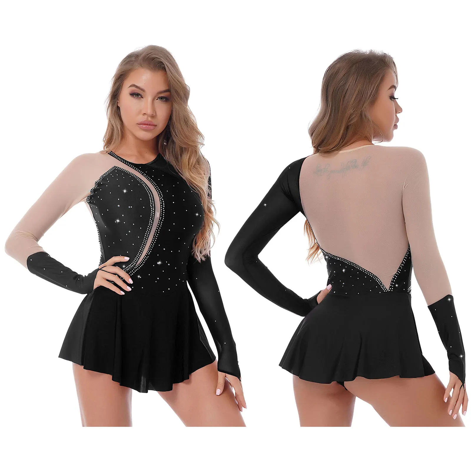 Женское Сетчатое платье для танцев с длинными рукавами и бретелькой через шею, стразы, Фигурное катание, Художественный гимнастический тренировочный костюм, трико, платья.