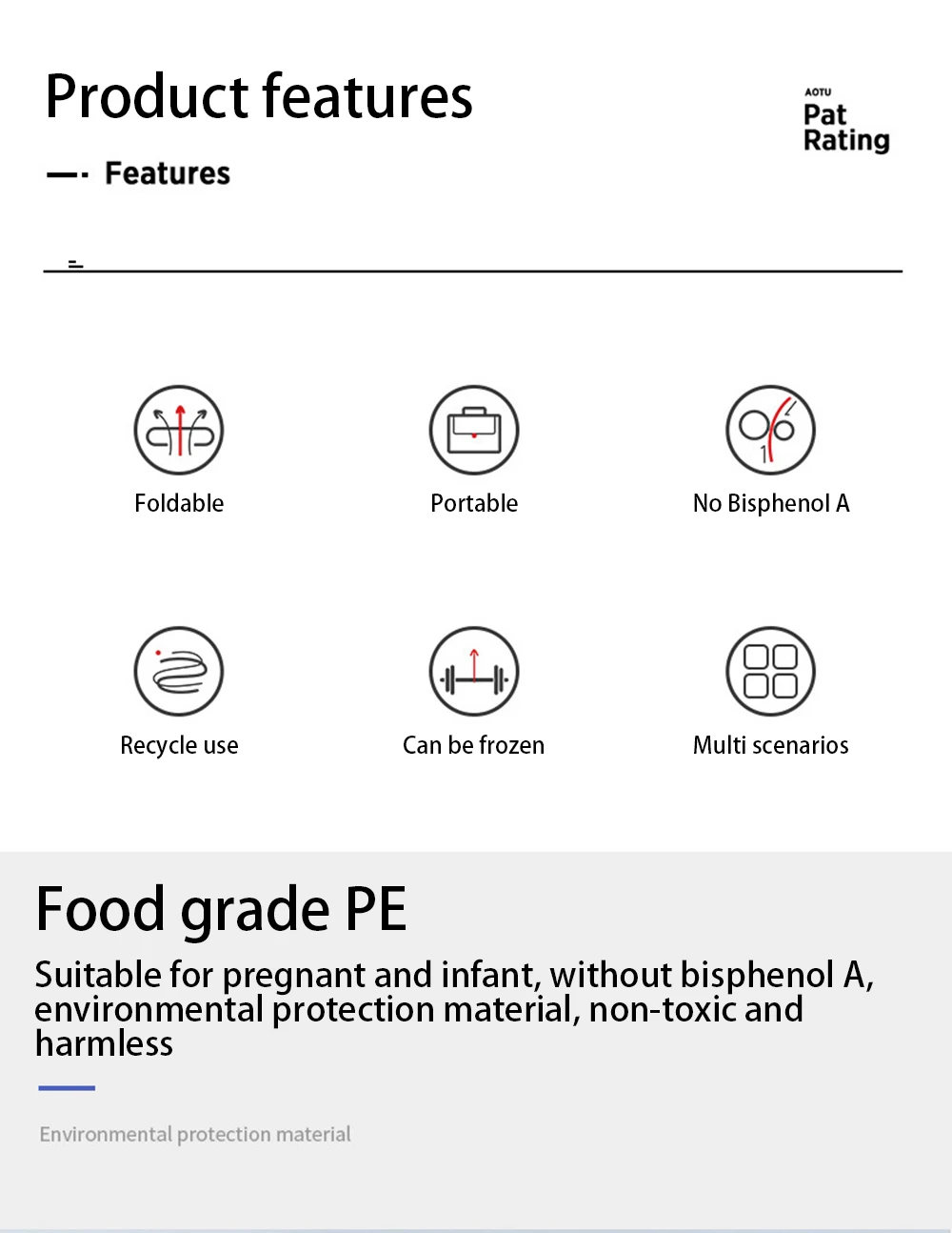 1. It is made of food grade LDPE4 and is tasteless. In addition, the transparent PE plastic can clearly identify the water line, which is convenient to use.