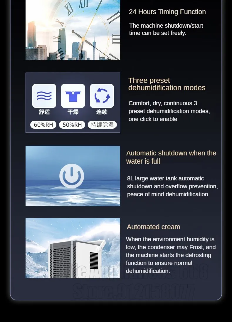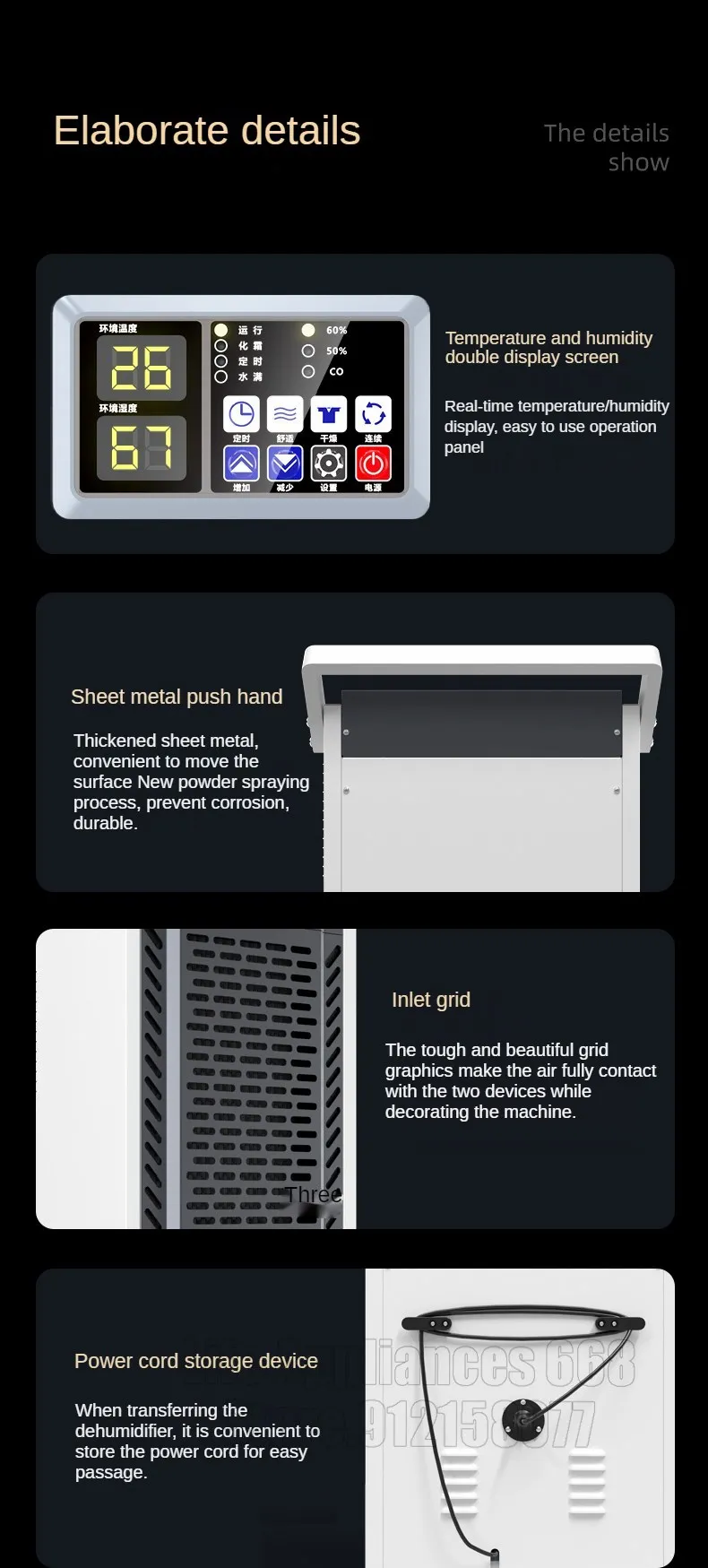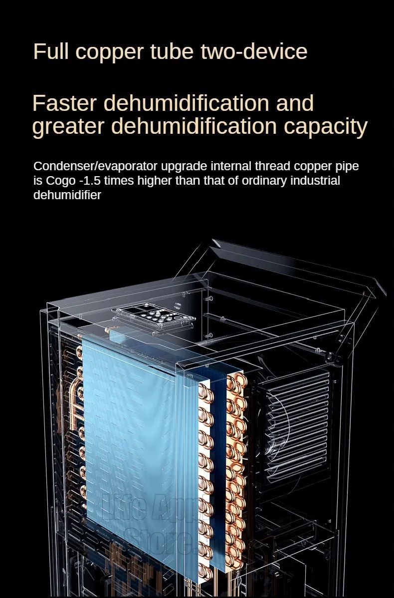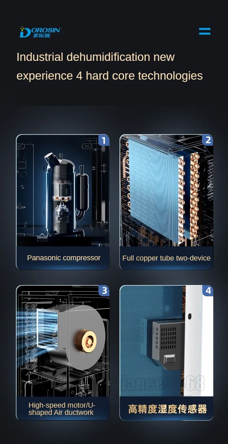 ● С помощью Panasonic компрессор, две полностью медные трубки, быстрее, абсорбирующее средство для удаления влаги и осушение емкость, Компрессорно-конденсаторный/испаритель обновления внутреннюю переплетенную медная трубка составляет 1-1,5 раз выше, чем у обычного промышленного осушителя воздуха
