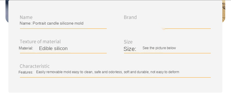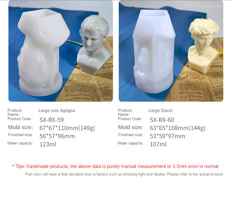| Название продукта: большая портретная силиконовая форма Материалы: nbsp; С snbsp; tu:DIY Форма для свечей шоколадная форма и т. д. Специальный snbsp; Прочный, новый по форме, изменяется в стилях, легко демпфируется и легко чистится без проникновения. |