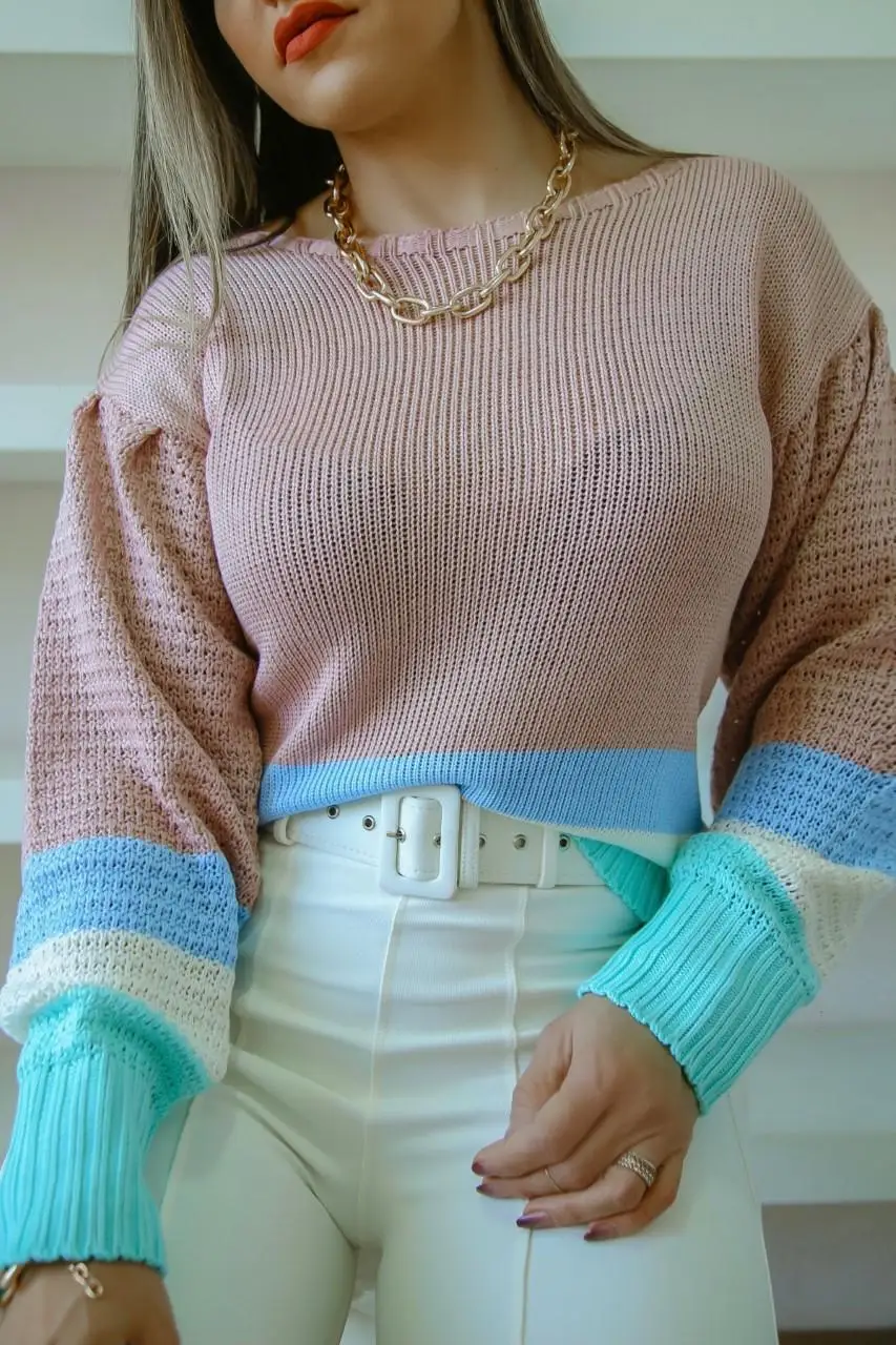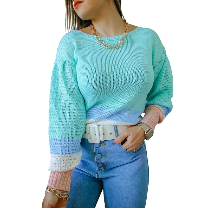 Полосатый контрастный цвет манжеты дизайн свободный женский элегантный вязаный свитер с расклешенными рукавами Блузка зеленая повседневная одежда больших размеров