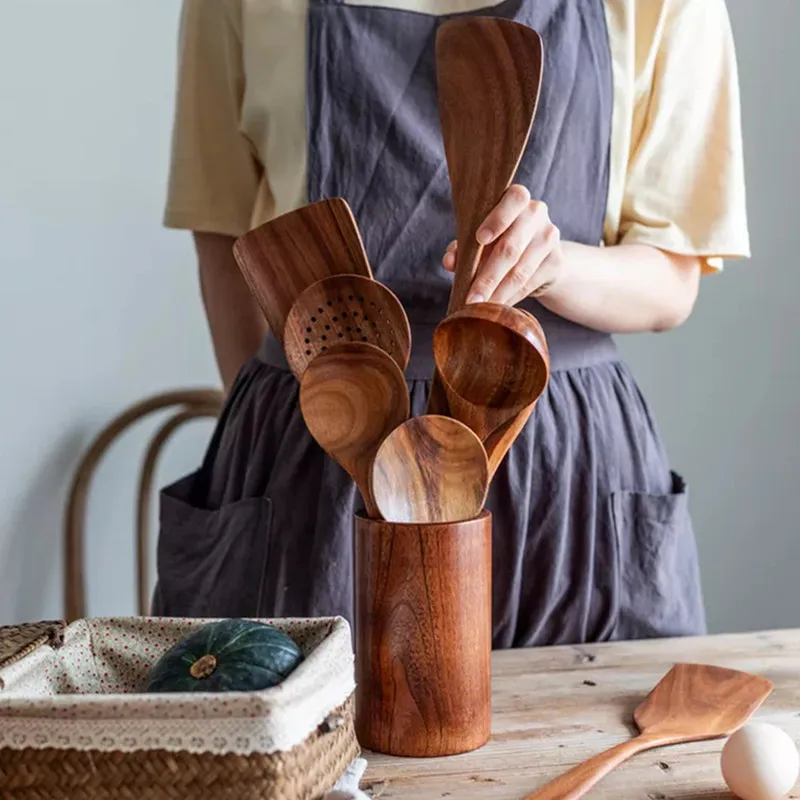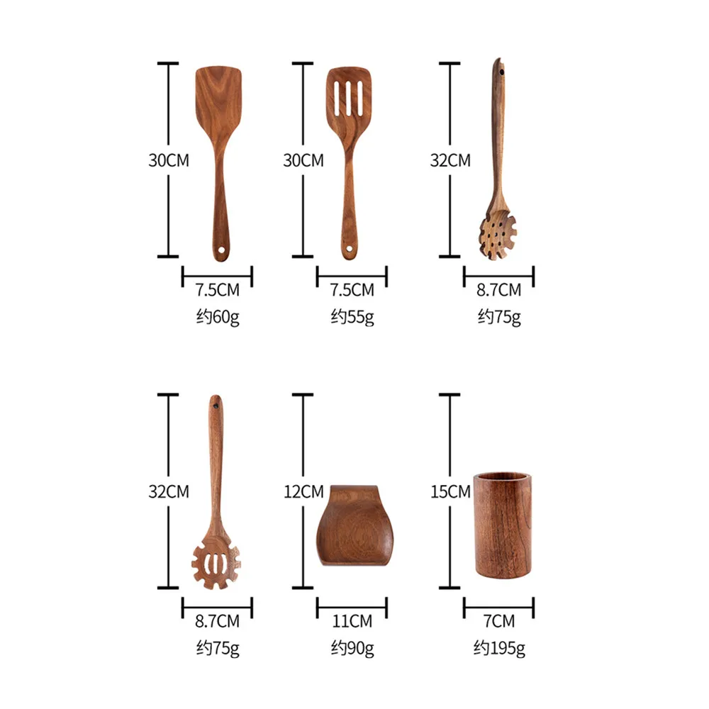 Набор кухонной посуды из натурального дерева из тикового дерева, ложка для посуды, ложка для ковша, Тернер, дуршлаг, шумовка для супа, кухонный многоразовый набор инструментов