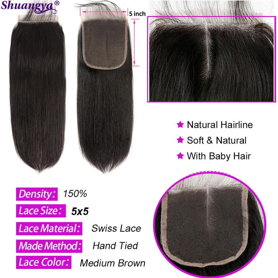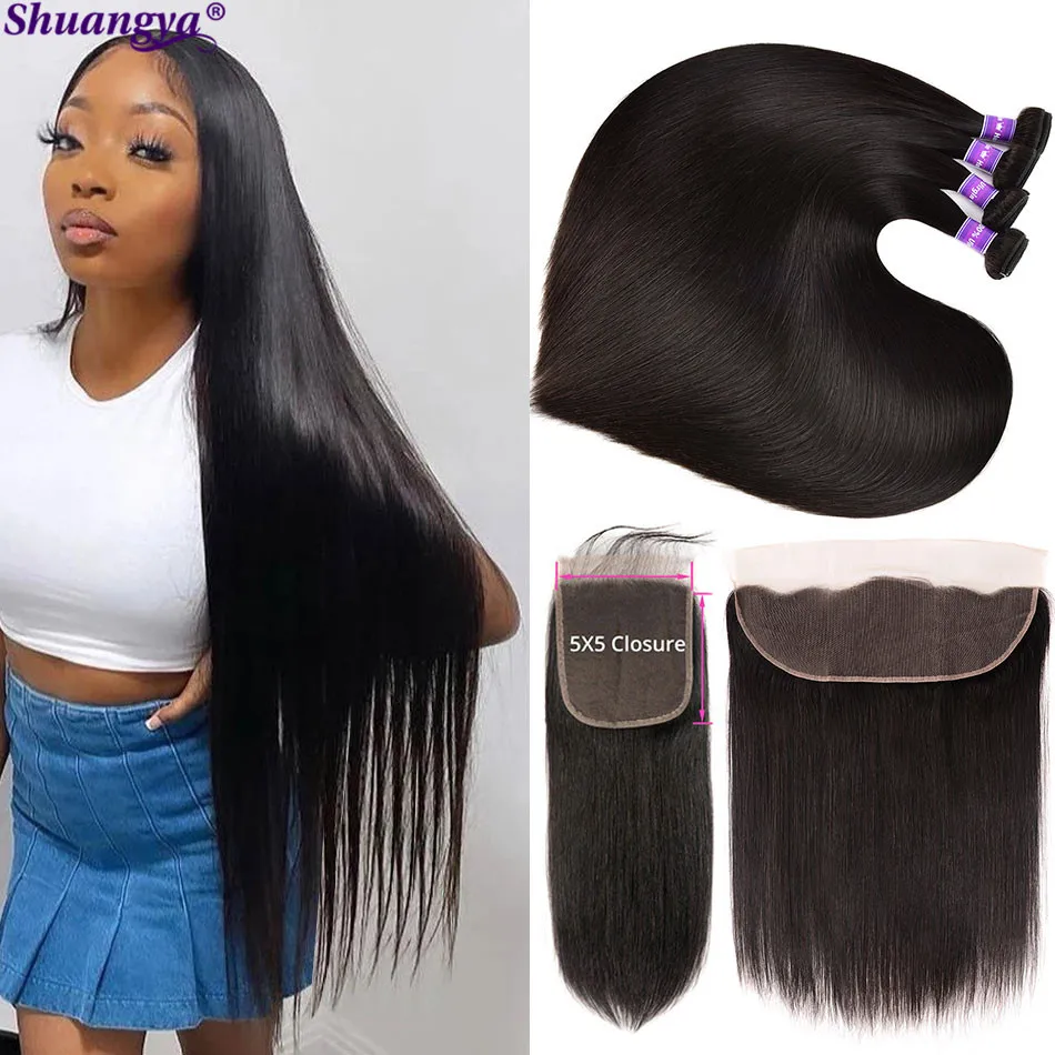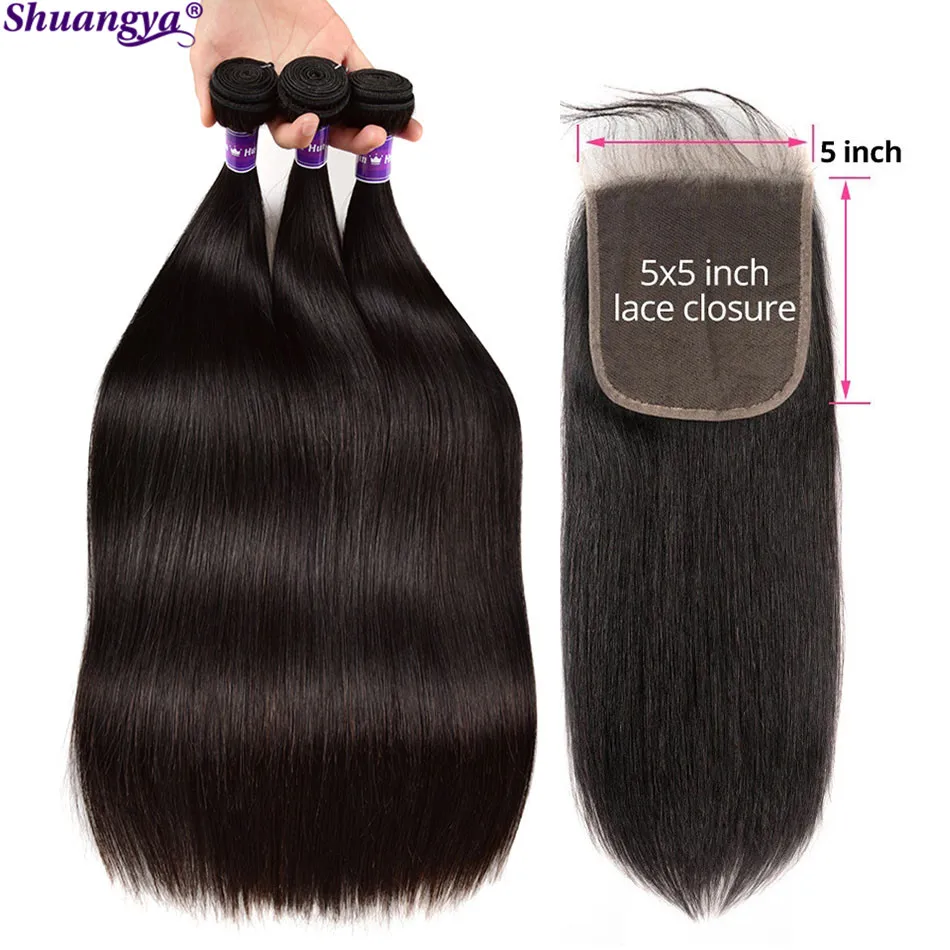 Бразильские прямые пучки с фронтальной прозрачной кружевной застежкой с пучками Shuangya волосы Remy человеческие волосы натуральный черный
