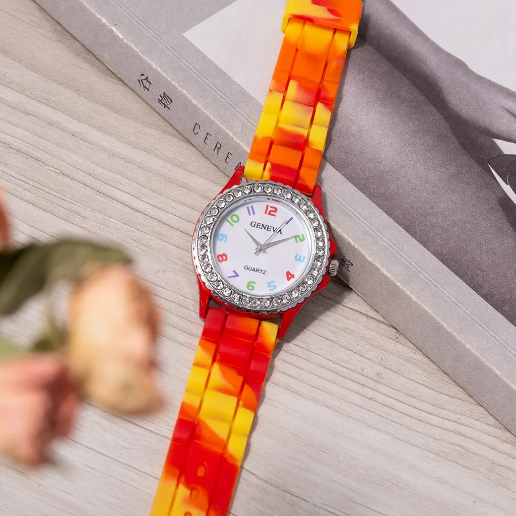 Женские часы модные повседневные Geneva радужные хрустальные стразы цифровые часы силиконовый ремешок круглые Студенческие Кварцевые часы для девушек XB40