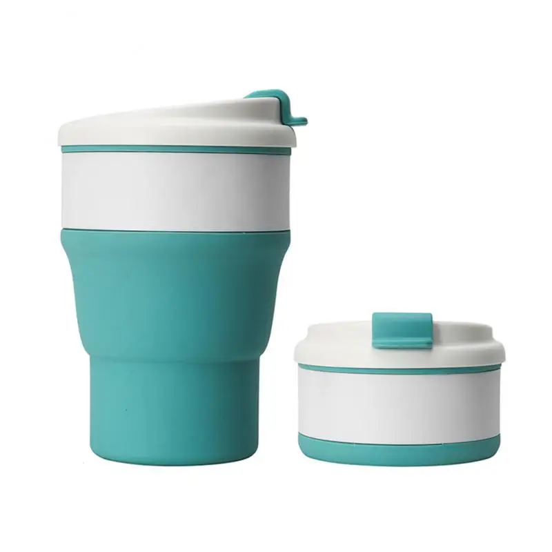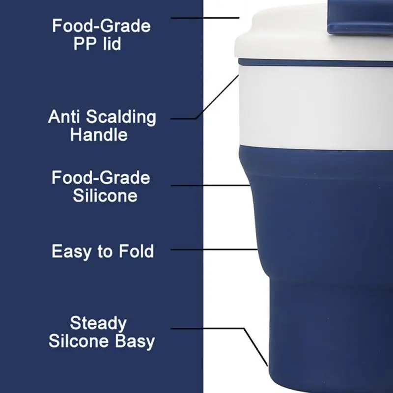 Чашка для путешествий из пищевого силикона, гарантированный обод из нержавеющей стали и пластиковая крышка, без BPA, одобрено FDA.