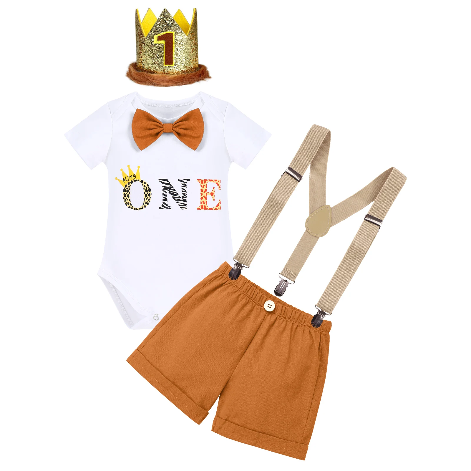 Дизайн: однотонный белый комбинезон с короткими рукавами и круглым вырезом; Контрастный бант на воротнике сделает вашего маленького мальчика похожим на маленького джентльмена. Принт с надписями на тему животных «один» или «1», который основан на истории «где Дикие Вещи», такой дизайн может вызвать интерес вашего ребенка, он будет рад носить его и не хочет снимать. Внахлест со спущенными плечами предлагает достаточно места для малышей движение, и с 3 кнопки на отстегивающейся передней частью в области шагового шва для легкого смена подгузников. Подходящие шорты с эластичным поясом для удобной посадки. Свернутый подол придает образу. Плюс с повязкой на голову и винтажными подтяжками, y-образной спинкой, регулируемой конструкцией с 3 прочными зажимами и 2 регулировщиками длины, легко открытая клипса, достаточно силы, чтобы держать брюки плотно. С помощью этого костюм для cake smash, маленький мальчик будет выглядеть нежно и смелым, он будет наслаждаться все самое интересное и получить его в одежде с тортом на свой первый день рождения, родители могут сделать видео или фотографии, чтобы сохранить этот драгоценный момент для вашего маленького парня.