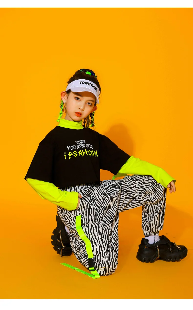 Kpop/детская одежда в стиле хип-хоп; Свитер укороченный топ с длинными рукавами; Уличная одежда; Брюки-карго с принтом зебры для девочек; Костюм для джазовых танцев