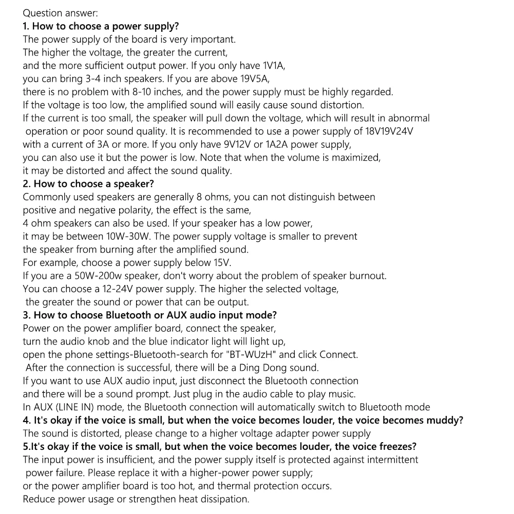 Рекомендуется использовать источник питания 18V19V2 4 в с током выше 5А. Если у вас есть только блок питания 9V12V или 1A 2A, вы также можете использовать его с низкой мощностью. Будьте осторожны при использовании при максимальной громкости, это может привести к искажению и повлиять на качество звука.