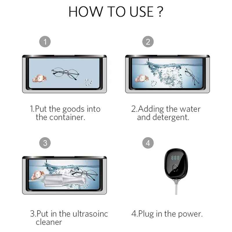 【Многофункциональность и портативность позволяет эффективно удалять жир, грязь и пятна ваших ювелирных изделий, бриллиантов или некоторых мелких вещей, таких как очки, горшки и игрушки. Компактный и портативный дизайн позволяет легко чистить вещи дома или в путешествиях