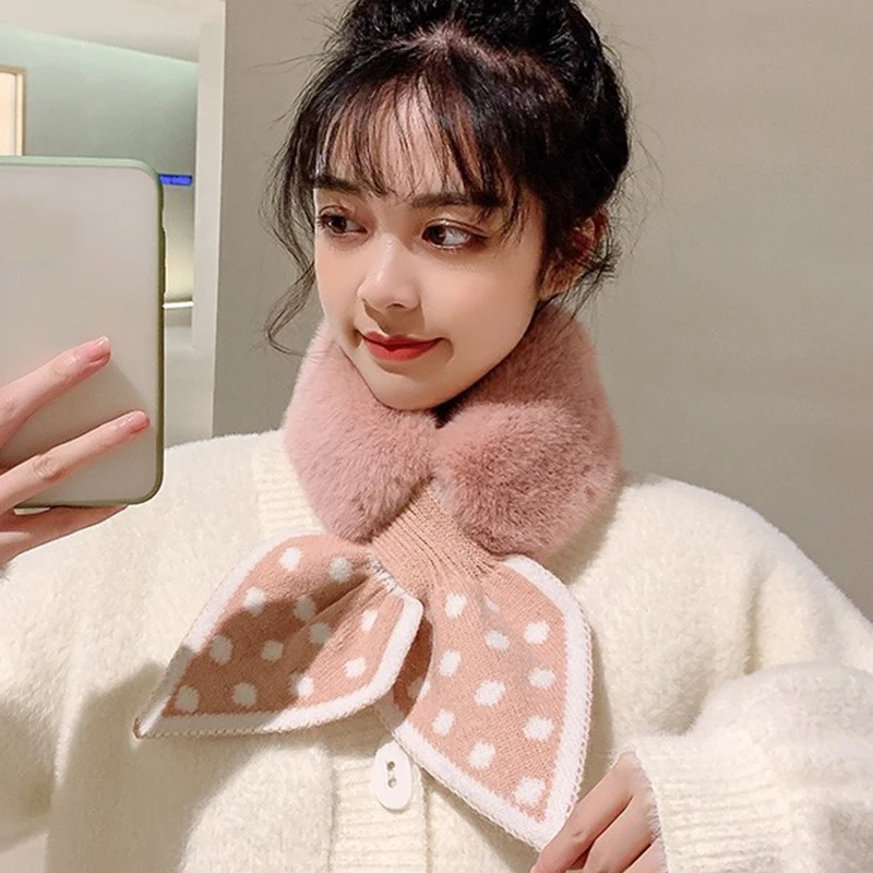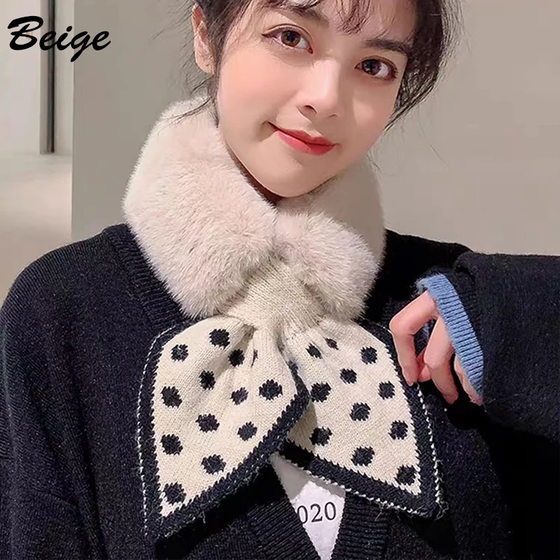 Плюшевый комбинезон с перекрестными ремешками, ветрозащитный Теплый вязаный шарф с волнистым бантом и имитацией кроличьего меха, милый женский шарф осень-зима