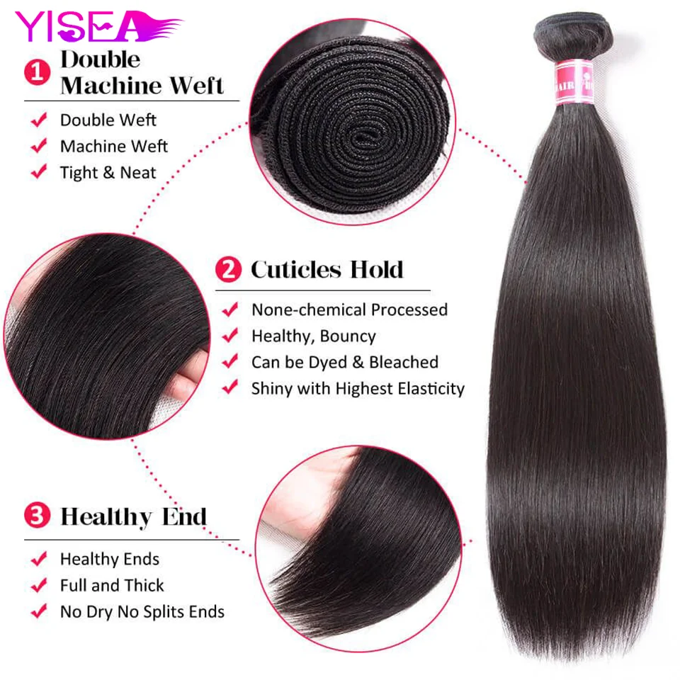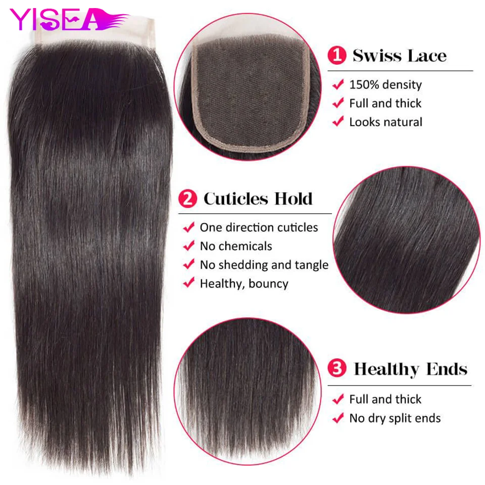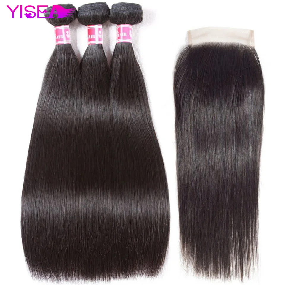Yisea прямые пряди волос с закрытием индийские волосы плетение пряди с закрытием Remy человеческие волосы пряди с закрытием для женщин