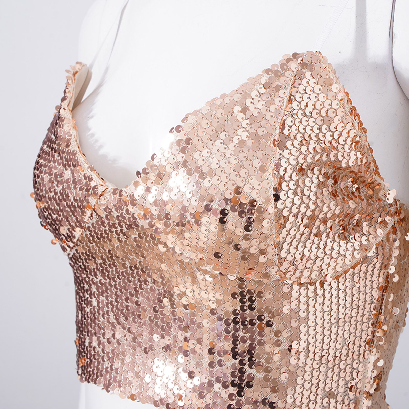 С блестящими блестками, регулируемым ремешком на тонких бретельках, v-образным вырезом, застежкой-молнией сзади.