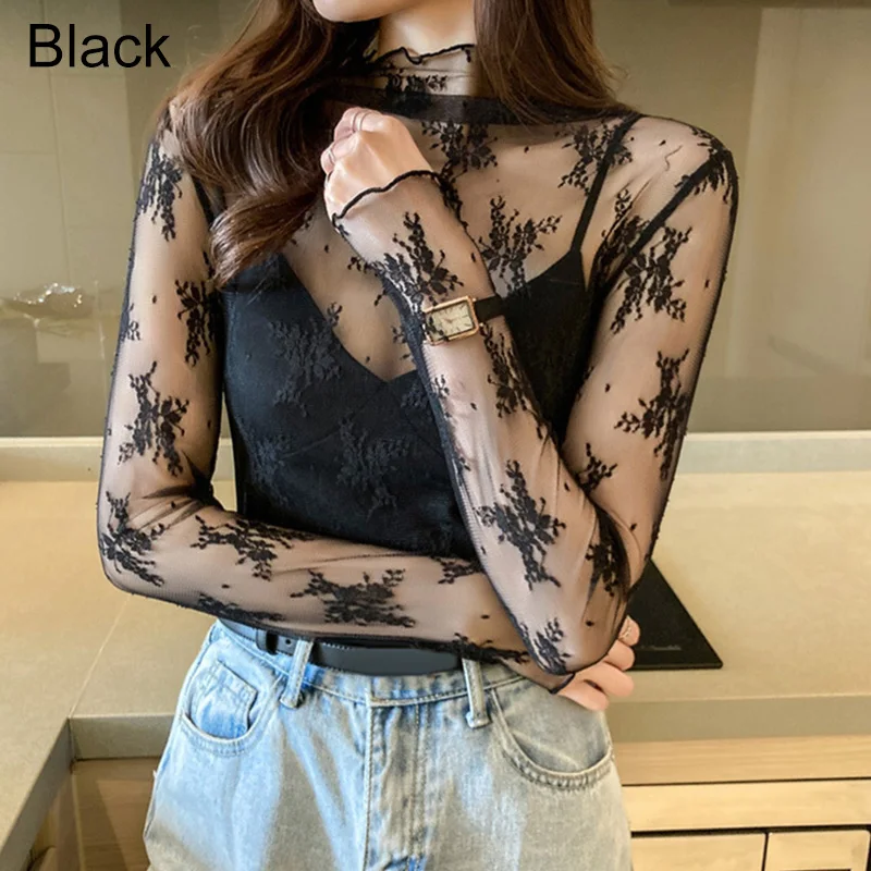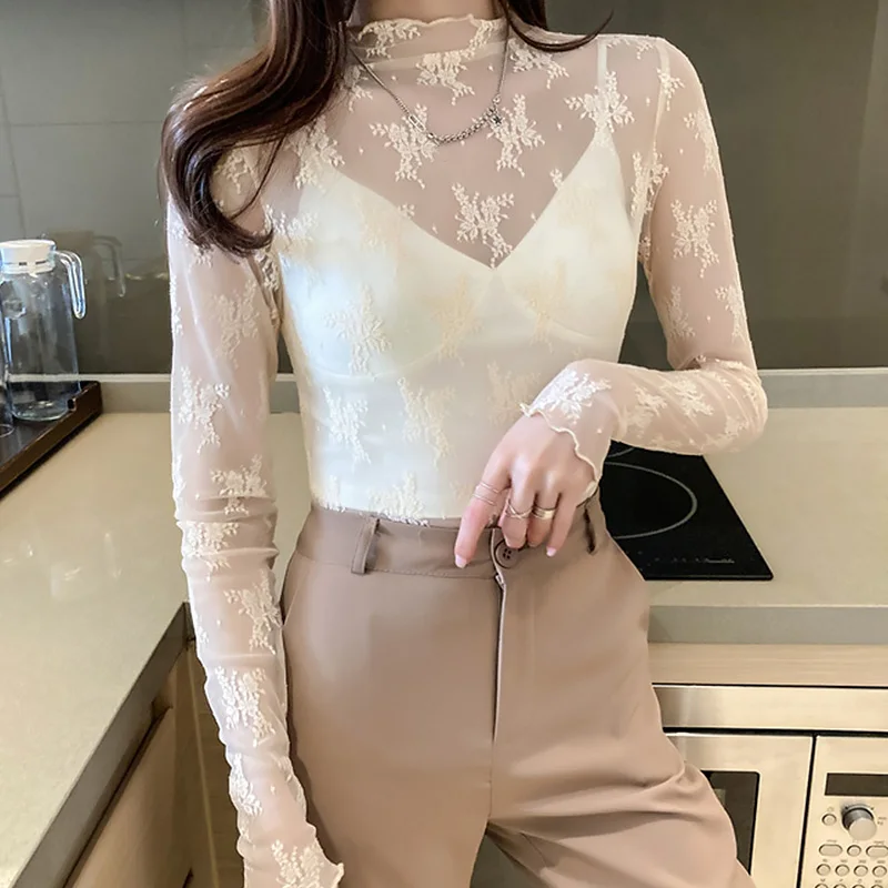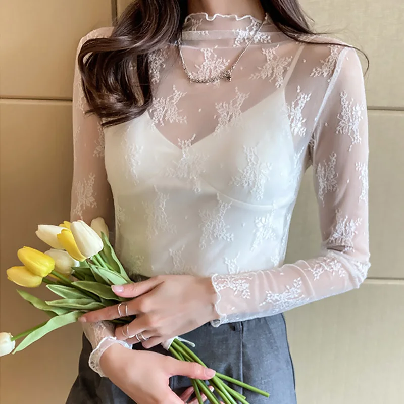 Новинка 2022, женская футболка на лето и весну, Прозрачный Женский сетчатый Базовый Топ с длинным рукавом, однотонный топ с вышитым цветочным кружевом