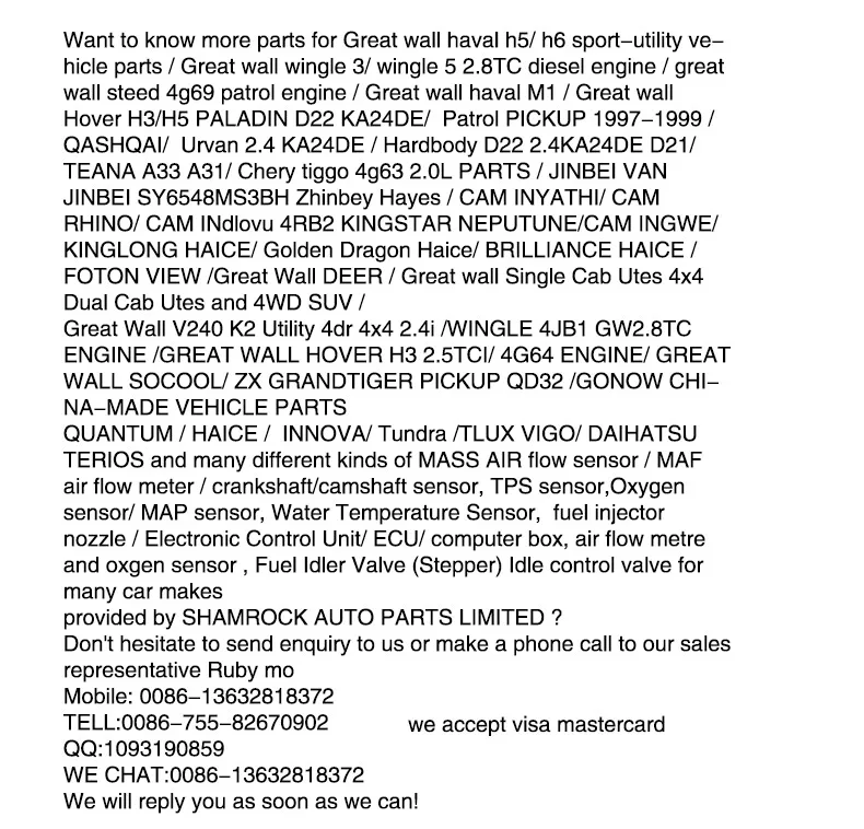 Хотите узнать больше деталей для Great wall haval h5/ h6 sport-utility Автозапчасти/Great wall wingle 3/ wingle 5 2.8TC дизельный двигатель/great wall steed 4g69 patrol engine/ Great wall haval M1 / Great wall Hover H3/H5 PALADIN D22 KA24DE/ Patrol PICKUP 1997-1999 / QASHQAI/ D21/ Altima U13 /TIIDA/ TEANA A33 A31/ Sentra 1.6GI / INFINITI / PATHFINDER / MAXIMA /