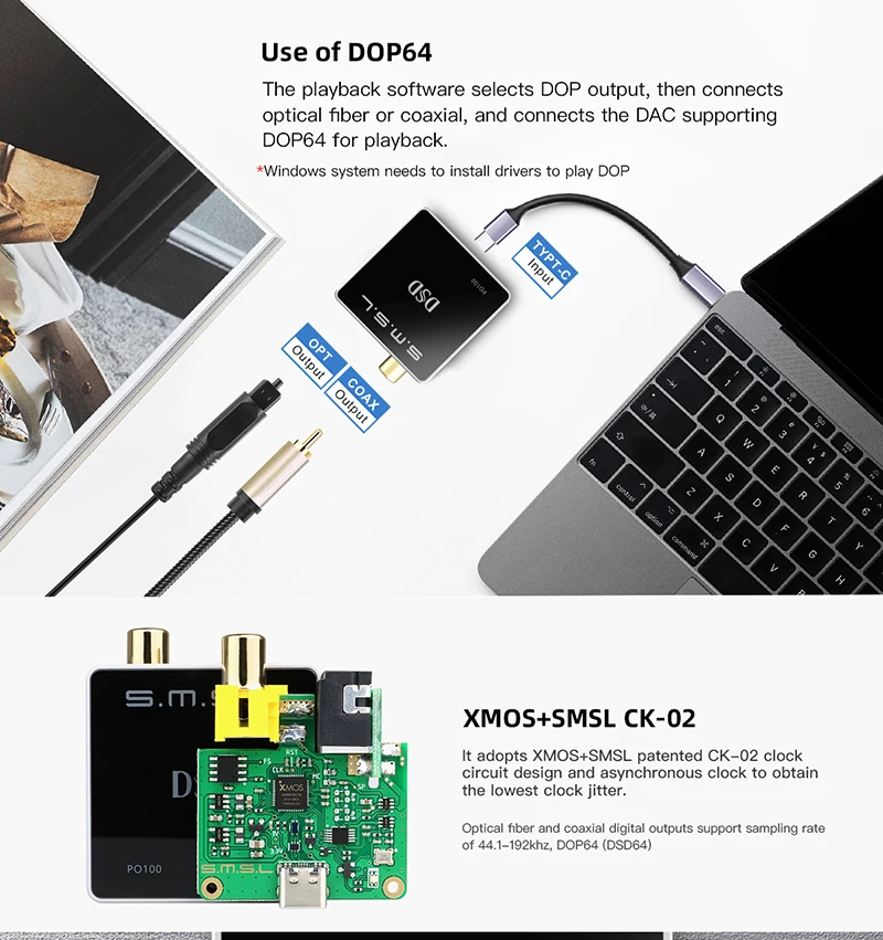 ♬XMOS и SMSL CK-02: он принимает XMOS и SMSL CK-02 дизайн часов и асинхронные часы для получения самого низкого дрожания часов. Оптические и коаксиальные цифровые выходы поддерживают частоту дискретизации 44,1-192 кГц, DOP64(DSD64).