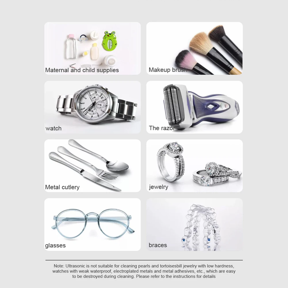 Широкое применение: его можно использовать для очистки ваших металлических часов, ювелирных изделий, очков, зубных протезов, кистей для макияжа и детских изделий.