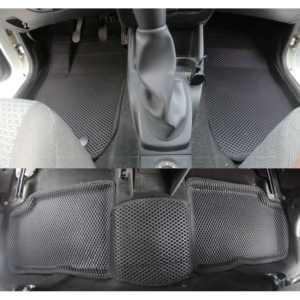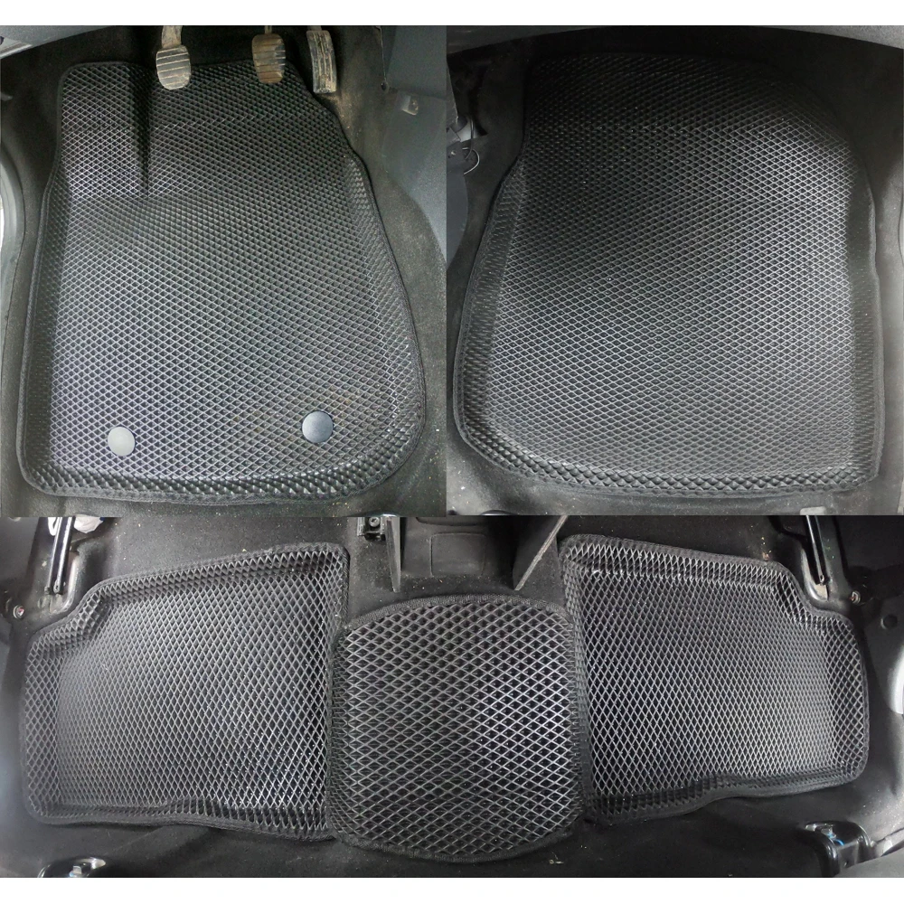 Основной идеей данных ковров является то, что данные ковры можно эксплуатировать без бортов, ведь вся влага собирается в самой текстуре ковриков. Вкупе с этим, данные коврики очень легко вытряхиваются от грязи. Все это работает если пол автомобиля полностью ровный, в том числе под педалями. Если же пол автомобиля не ровный, то влага, собирающееся на неровностях будет стекать в соседние соты, а затем за пределы коврика, что недопустимо. Именно поэтому начали появлятся eva 3d коврики. Коврики, которые повторяют контур пола автомобиля, со всеми его неровностями. Это гарантирует задержку влаги и грязи в пределах ковриков, да и к тому же такие коврики более лаконично смотрятся в салоне авто.