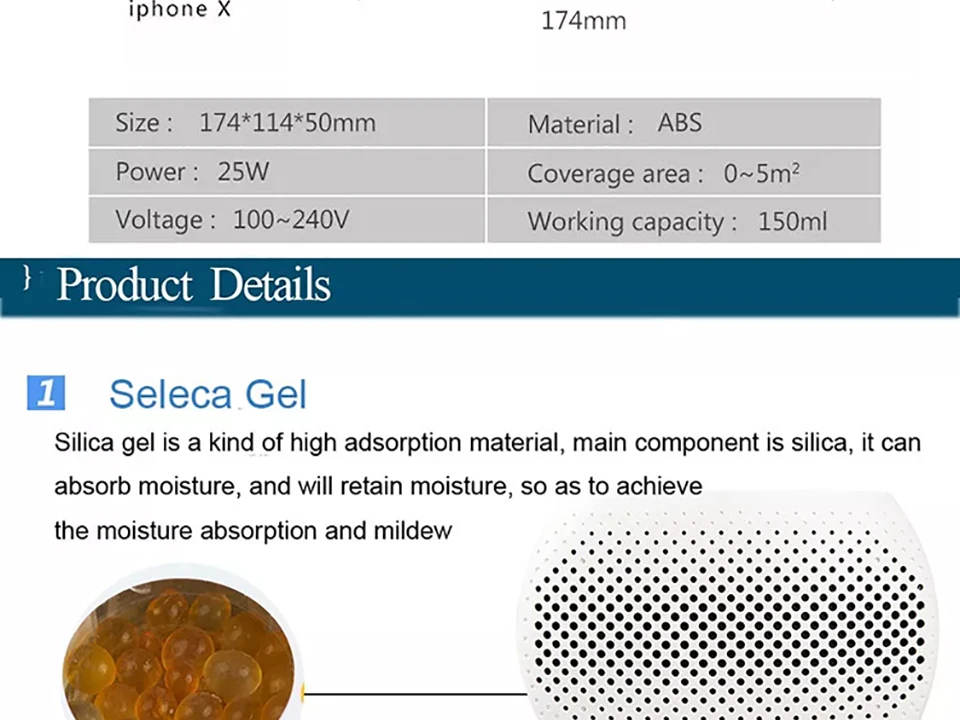 Напряжение (В):100-240 ВМощность (Вт):25 ВтРазмер (мм):190*125*55 ммВес нетто (г):730 гВес брутто (г):933 гЦвет: синий светильник, синий, белыйРабочая емкость (мл/Д): 250 мл/циклОдновременное рабочее время (D): около 10Материал: антипламенный АБС-пластикШум (дБ):15Лучшая температура и влажность: 10 °C-30 °C,40%-80%Рекомендуемое пространство осушителя (м²): 0-5Функция:Adustable humidistat, автоотключение, автоматическая разморозка, светодиодныйДисплей, возобновляемый, перезаряжаемый, беспроводной, безопасный и бесшумный, энергосбережение, уменьшение вреда от пыли, вредное зерно, специфический запахПрименениеМаленькие места: шкаф, книжный шкаф, обувная коробка, детская комната, шкаф, подвал, шкафДругие функции:1. Он может эффективно уменьшить влажность в помещении, уменьшить дискомфорт ревматизма, артрита, невралгии, бронхита, астмы и других2. Это может эффективно уменьшить рост плесени и других бактерий3. Он может эффективно защитить предметы мебели, продукты питания, медицину, книги от ухудшения формы.4. Он может повредить электромашину, компьютер, камеру, оборудование от дополнительной влаги