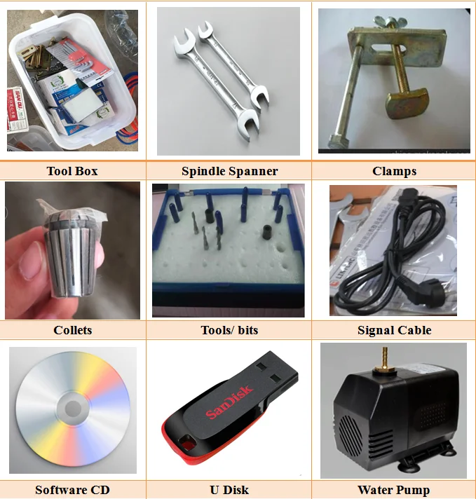Дополнительные детали | 1,Роторное устройство для обработки круглых материалов, 100 мм (+ US $400)/150 мм (+ US $450) 2,MACH3 система управления: + USD 150; DSP + US $300; 3, бак для воды и распылитель воды для мягкого металла + $150 США; 4,2.2kw шпиндель + US $100; 3.0kw шпиндель + US $200; 5. Вакуумный стол с 2.2 кВт Вакуумный насос + $400 США |