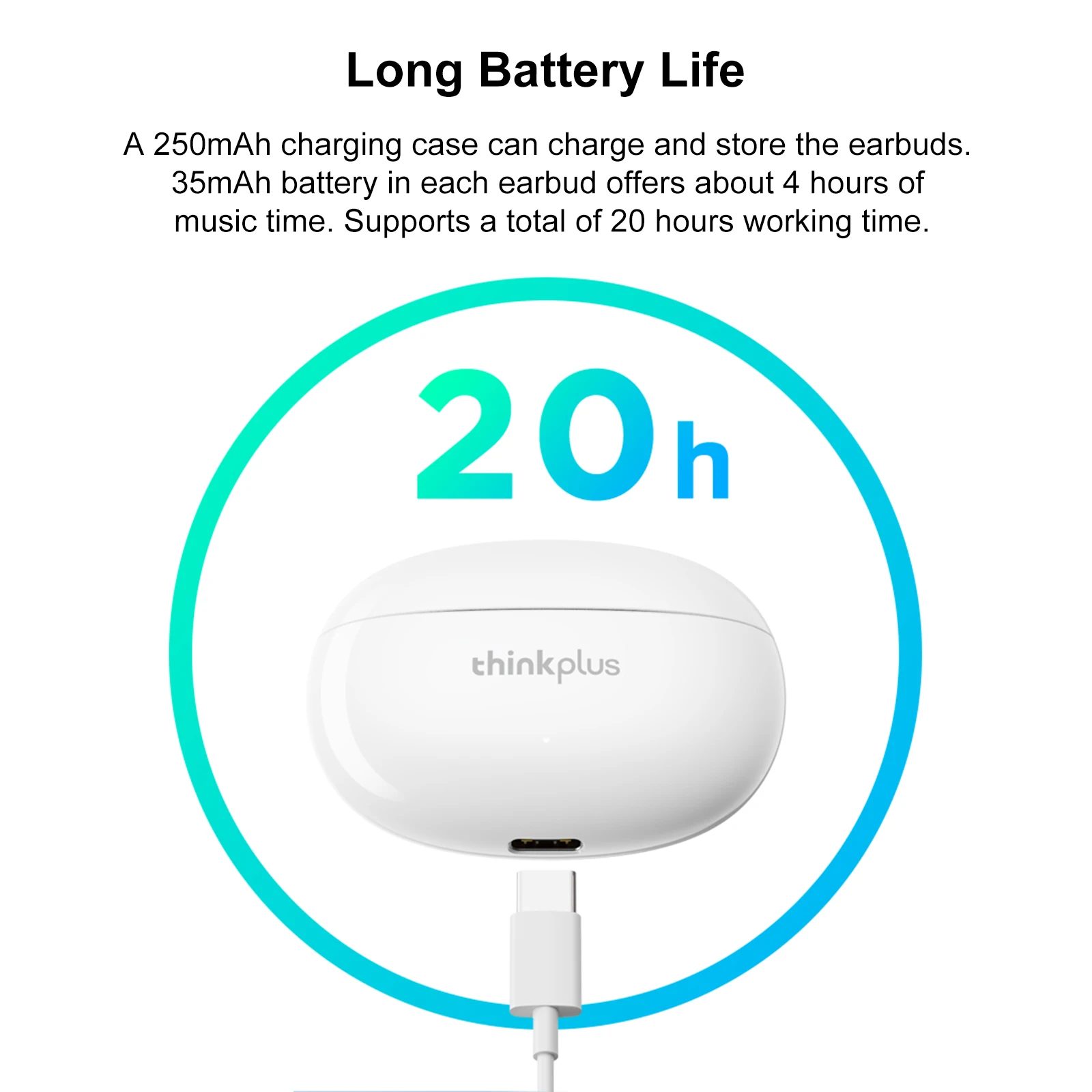 Зарядный чехол емкостью 250 мАч может заряжать и хранить наушники. Аккумулятор 35 мАч в каждом наушнике обеспечивает около 4 часов воспроизведения музыки.