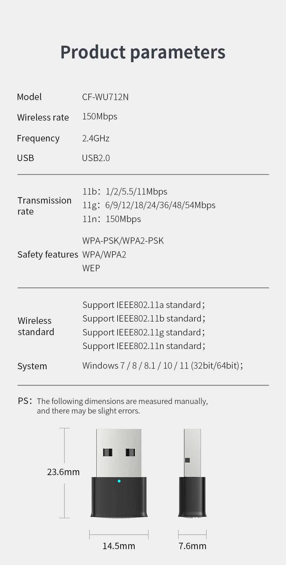 CF-WU712N-это беспроводная сетевая карта mini USB. С Wi-Fi передатчиком и функцией Wi-Fi приемника, может использоваться для настольного беспроводного доступа в Интернет, или передача сигнала Wi-Fi, когда есть сеть без маршрутизации для терминальных устройств, таких как мобильные телефоны/колодки для доступа в Интернет. Характеристики продукта Мини внешний вид, портативное использованиеCF-WU712N принимает новый внешний вид, небольшой и портативный, не занимает слишком много места, очень удобно носить с собой и использовать, И интерфейс USB изготовлен из специального никелированного материала, чтобы предотвратить появление ржавчины, текстуры и практичности. 150 Мбит/с скорость беспроводнойCF-WU712N принимает беспроводную технологию 11N, скорость беспроводной передачи до 150 Мбит/с, передача данных в локальной сети более эффективна, и голос и видео, онлайн по требованию, И онлайн-игры более гладкие. Функция беспроводного приема, избавьтесь от сетевого кабеляCF-WU712N соответствует стандарту беспроводной связи IEEE802.11b/g/n, подходит для приема 2,4G сигнала беспроводной сети, сигнала Wi-Fi, WLAN, CMCC и других беспроводных сигналов, стабильная Suga, что обеспечивает комфортное обслуживание пользователей. Имитируйте AP и превратите его в миниатюрный «роутер» за считанные секундыВ отсутствие беспроводного маршрутизатора/AP Подключите CF-WU712N к компьютеру и установите его в режим AP, затем он эквивалентен беспроводной AP, который может поддерживать Wi-Fi других беспроводных устройств, таких как ноутбуки, смартфоны и колодки Wi-Fi.Особенности