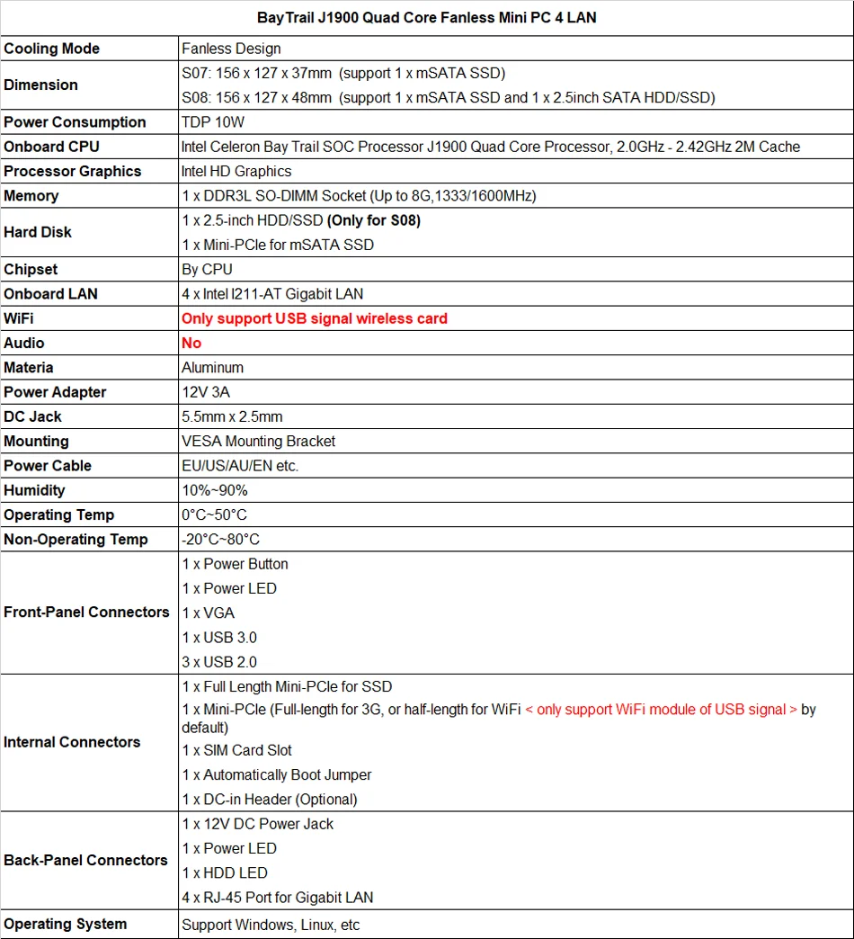 1. Безвентиляторный, нулевой шум. 2. Может работать как маломощное устройство брандмауэра, поддержка Sophos UTM, CentOS и т. Д. 3. Простота в эксплуатации, нажмите DELETE ввод в BIOS, F11 загрузки с USB диска. 4. Память и память могут быть вывезены для замены другой емкости самостоятельно. 5. BIOS может настроить для автоматического запуска после прерывания питания, определенного времени запуска. 6. Все мини-ПК/аксессуары прошли проверку качества перед отправкой. 7. Предоставляется полная гарантия на один год. 8. Индивидуальный/печатный логотип является приемлемым и бесплатным.