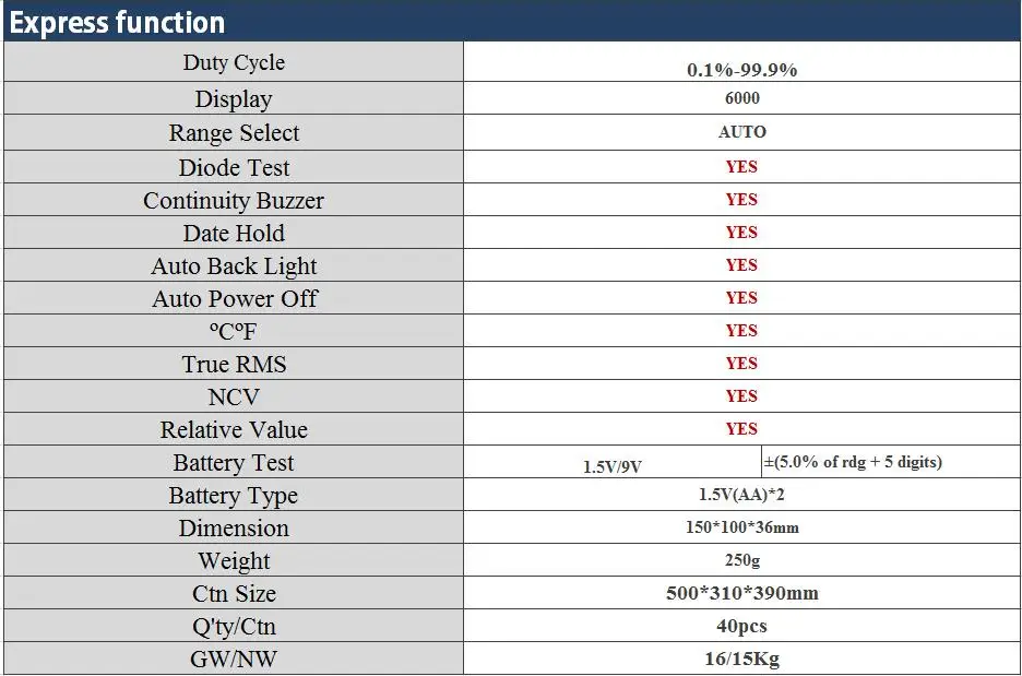 Хранение данных 1 Тест напряжения постоянного/переменного тока 1 Тест постоянного/переменного тока 1 Тестовый Диод 1 Зуммер непрерывности 1 Дата удержания 1 Автомобильная светильник ка Автоматическое отключение 1 Преобразование в Фаренгейт 1 NCV/истинное среднеквадратичное значение/относительное значение 1 Тест сопротивления/емкости/температуры/частоты/рабочего цикла 1