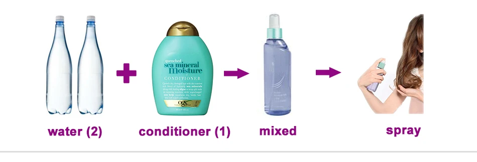 Также вы можете сделать спрей с помощью воды и кондиционера (Соотношение 2:1), распылите его для ежедневного увлажнения, а также для кончиков волос. Это особенно хорошо для вьющихся волос.