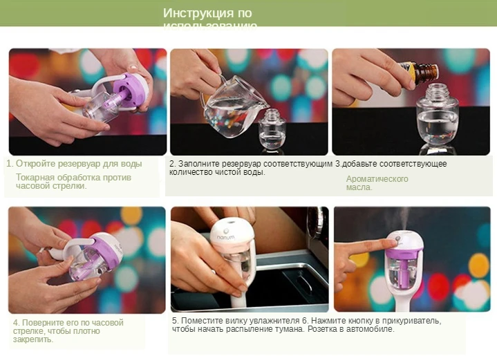 Технические характеристики: Цвет: синий, зеленый, розовый, фиолетовый. Синий Количество: 1 Материал: АБС, ПП Размеры: 5,7*5,6*16,4 см Операционной Напряжение: DV12V Рабочий ток: 130-150mA Мощность использования: 1,5-2 Вт Емкость для воды: 50 мл Объем распыления: 25 мл/ч Время работы: два часа выключается автоматически