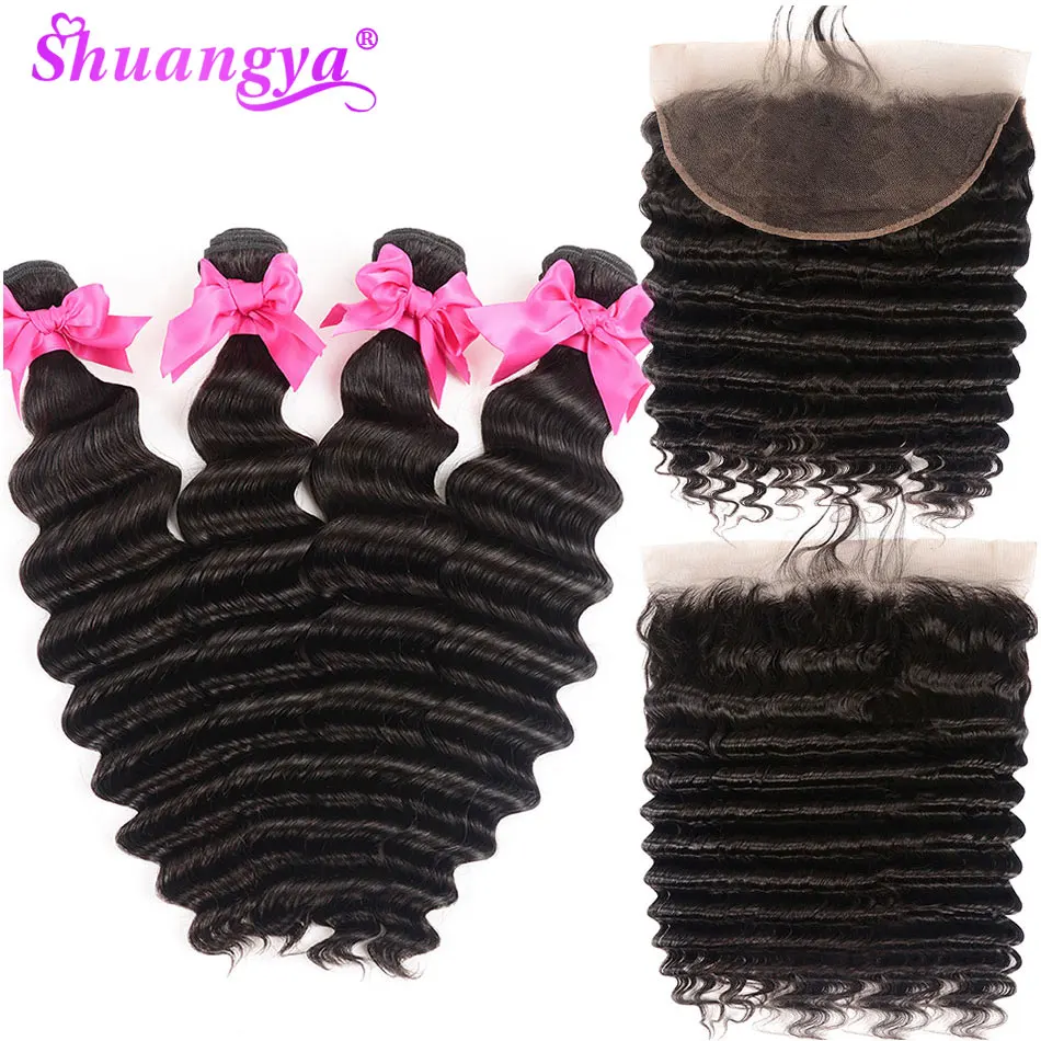 Свободная глубокая волна пучки с фронтальной бразильские волосы плетение пучки с закрытием Shuangya девственные волосы кружева Фронтальная с пучками