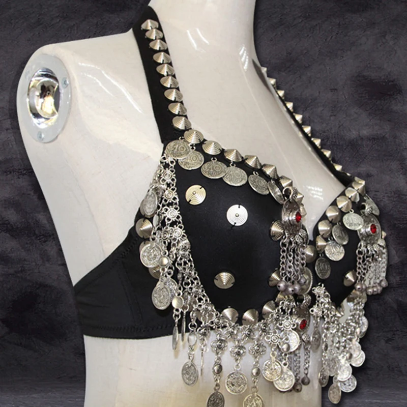 Этот монеты Племенной бюстгальтер построен на черном лайкра база, и металлическими заклепками и монеты, украшенный красными стразы и металлической цепочкой, драп. Прекрасное начало для любого племени/АТС или фольклорного костюма. Бюстгальтер изготовлен на слегка мягких, форменных, проводных чашечках бюстгальтера с хлопковой тканевой спинкой и лямками на шее. Особенности 2 ряда крючков и глаз для дополнительной поддержки и комфорта. Приблизительные размеры/Размеры: S: 34C/75C, ширина груди: 63 см-77 см (свободный), обхват груди: 90 см M: 36C/80C, ширина груди: 65 см-80 см (свободный), обхват груди: 95 см L: 38C/85C, ширина груди: 70 см-82 см (свободный), обхват груди: 100 см XL: 38D/85D, под грудью Ширина: 70-82 см (расслаблено), Бюст: 105 см