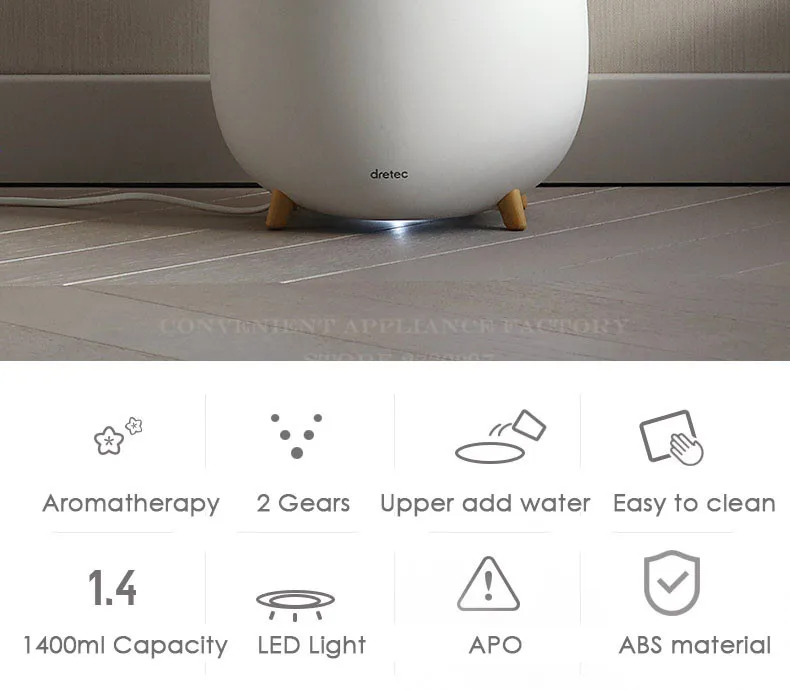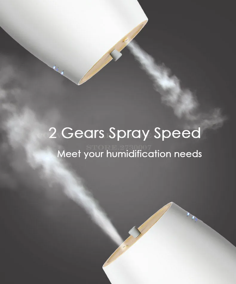 ●1400ml large capacity, spray speed is 100ml/h-200ml/h, can continuous humidification for 7 hours, humidification for whole night; ●With a aromatherapy cotton box, you can drop the essential oil on the aroma cotton to give you a better experience; ●2 gears spray speed; ●Upper type add water, separated water tank, easy to add water and easy to clean with water tank; ●LED light are designed for night use; ●Simple design, beautiful appearance, it is not only a humidifier ,but also a desktop art.