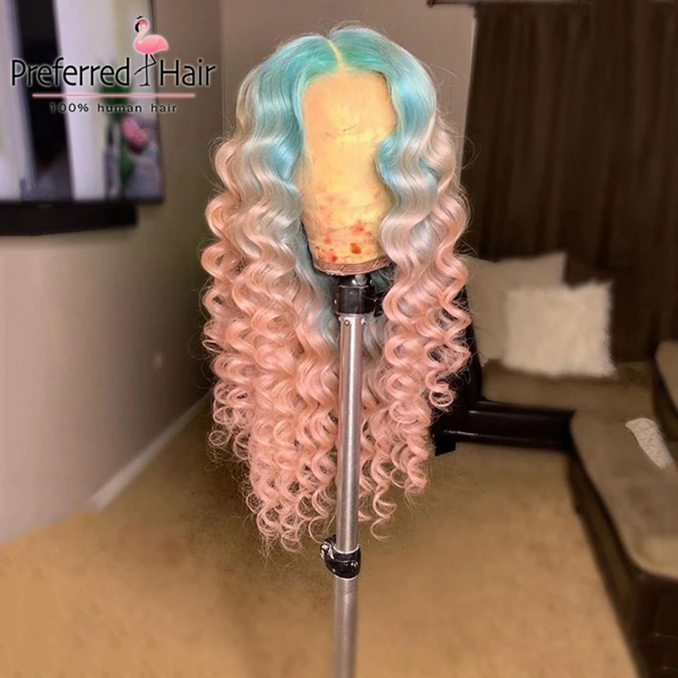Цвет радуги розовый зеленый Омбре кружевные передние человеческие волосы парики для женщин