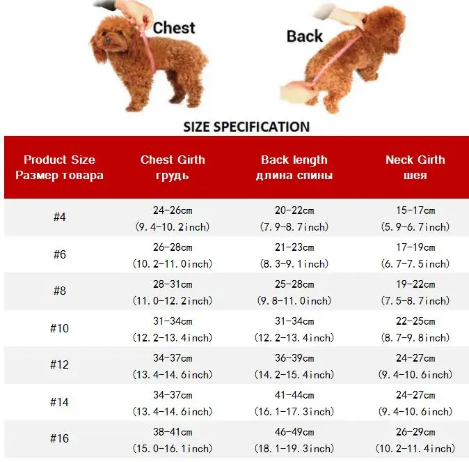 Размер 4 --- Длина: 20-22 см, обхват груди: 24-26 см, обхват шеи: 15-17 см.Размер 6 --- длина: 21-23 см, обхват груди: 26-28 см, обхват шеи: 17-19 см.