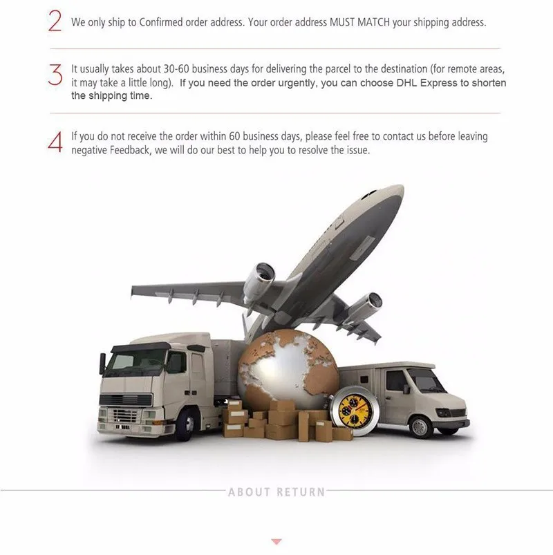 Примечание:Это общее руководство и задержки, которые могут быть вызваны форс-мажорными обстоятельствами, природными катаклизмами, погодными условиями, войнами, праздничными днями, И факторы вне нашего контроля. | ||
