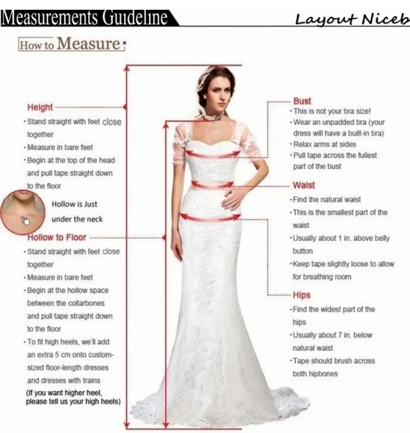 Если вы хорошо знаете размер своего тела и не можете повторно измерить его, вы можете заказать свадебное платье в соответствии со стандартным размером. Пожалуйста, проверьте детальные данные и отправьте заказ в ближайший к вашему телу размер данных.