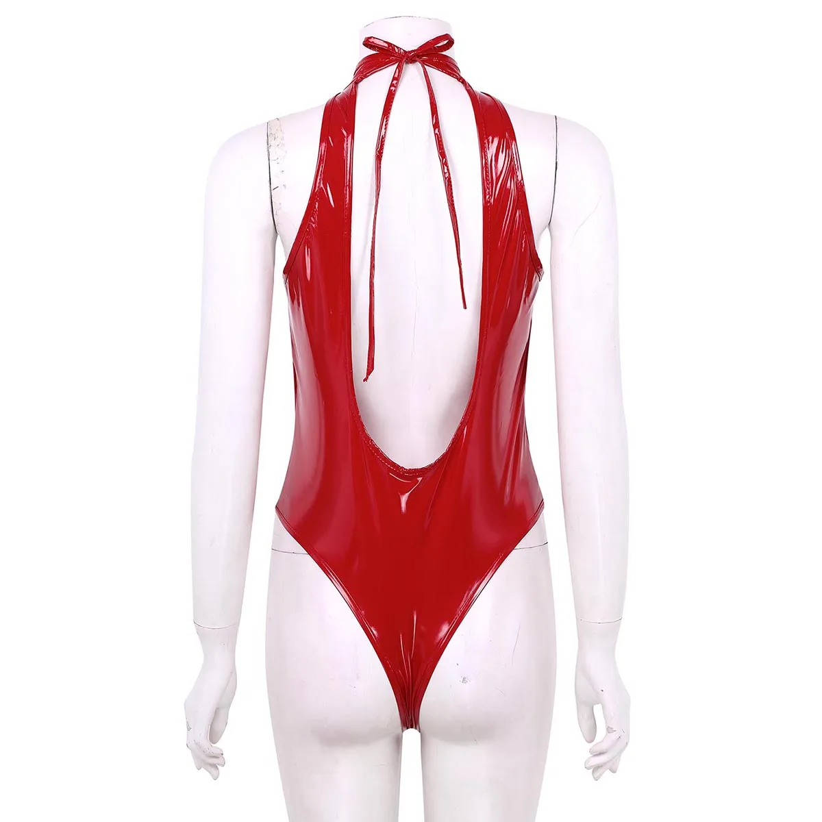 Women’s hot one piece patent leather lingerie thong leotard bodysuit, wet look appearance.
